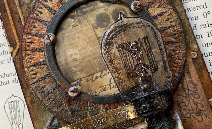 Hello there…and happy Friday! I hope that you are all doing well. I have a new tutorial for you today and this one, you guessed it, uses another tiny light bulb created with The Professor stamp set, and one of my new favorite bigz, the Steampunk Parts…it’s kind of my addiction lately. I can’t believe how versatile the Steampunk Parts…