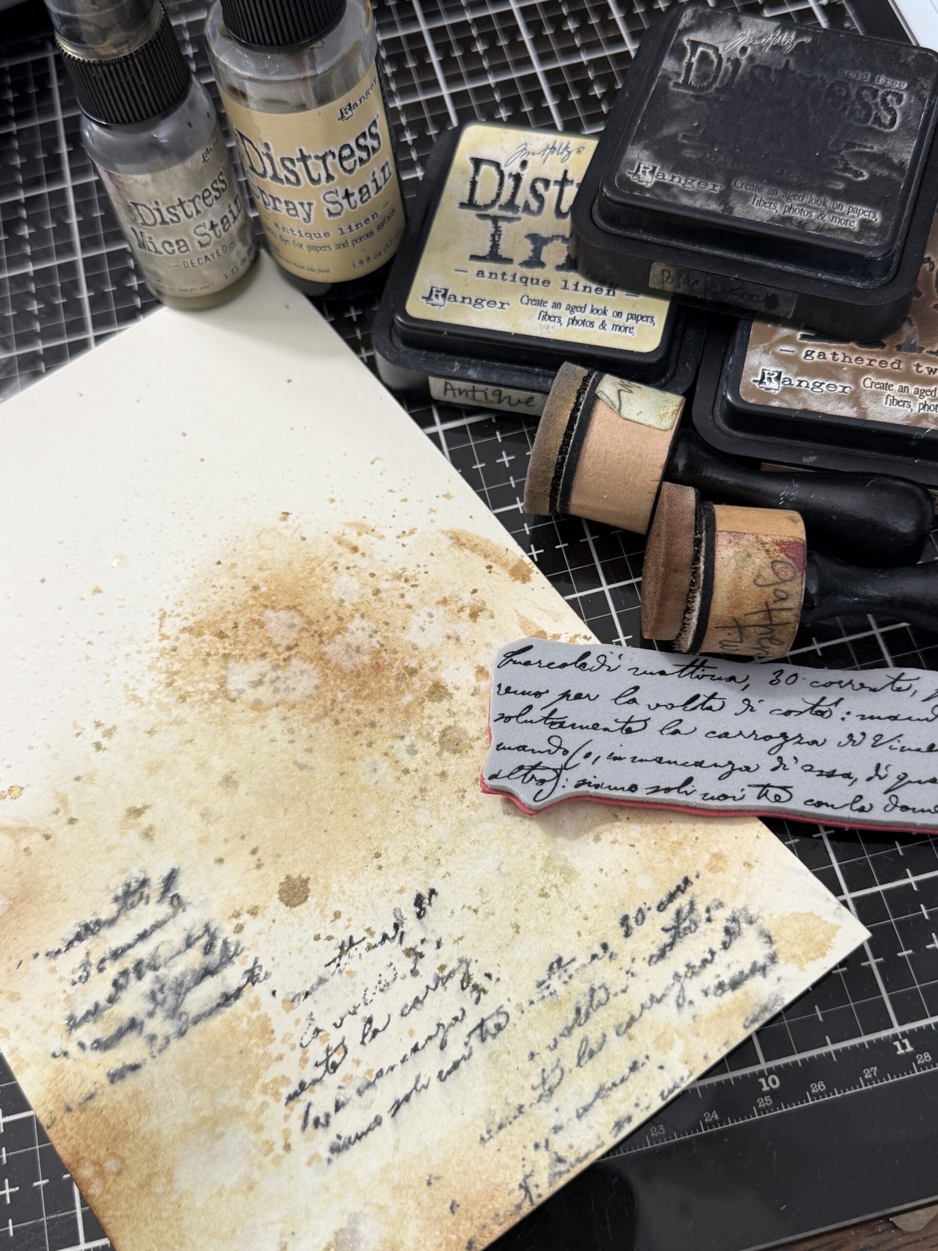 The inky card started by creating a background using Distress Watercolor Paper. I spritzed a piece of paper with water then a combination of Antique Linen Spray Stain and a little Decayed Distress Mica Stain, then dried with with my heat tool. Next, I began stamping some handwritten background randomly around the paper, spritzed it with water, then dried with my heat tool. I blended around some Gathered Twigs ink using a blending tool, then spritzed on some drips, dried the paper with a heat tool, and daubed up some of the water droplets with a cotton towel.