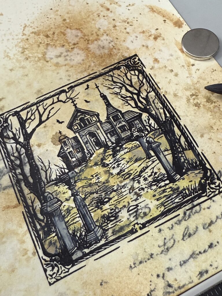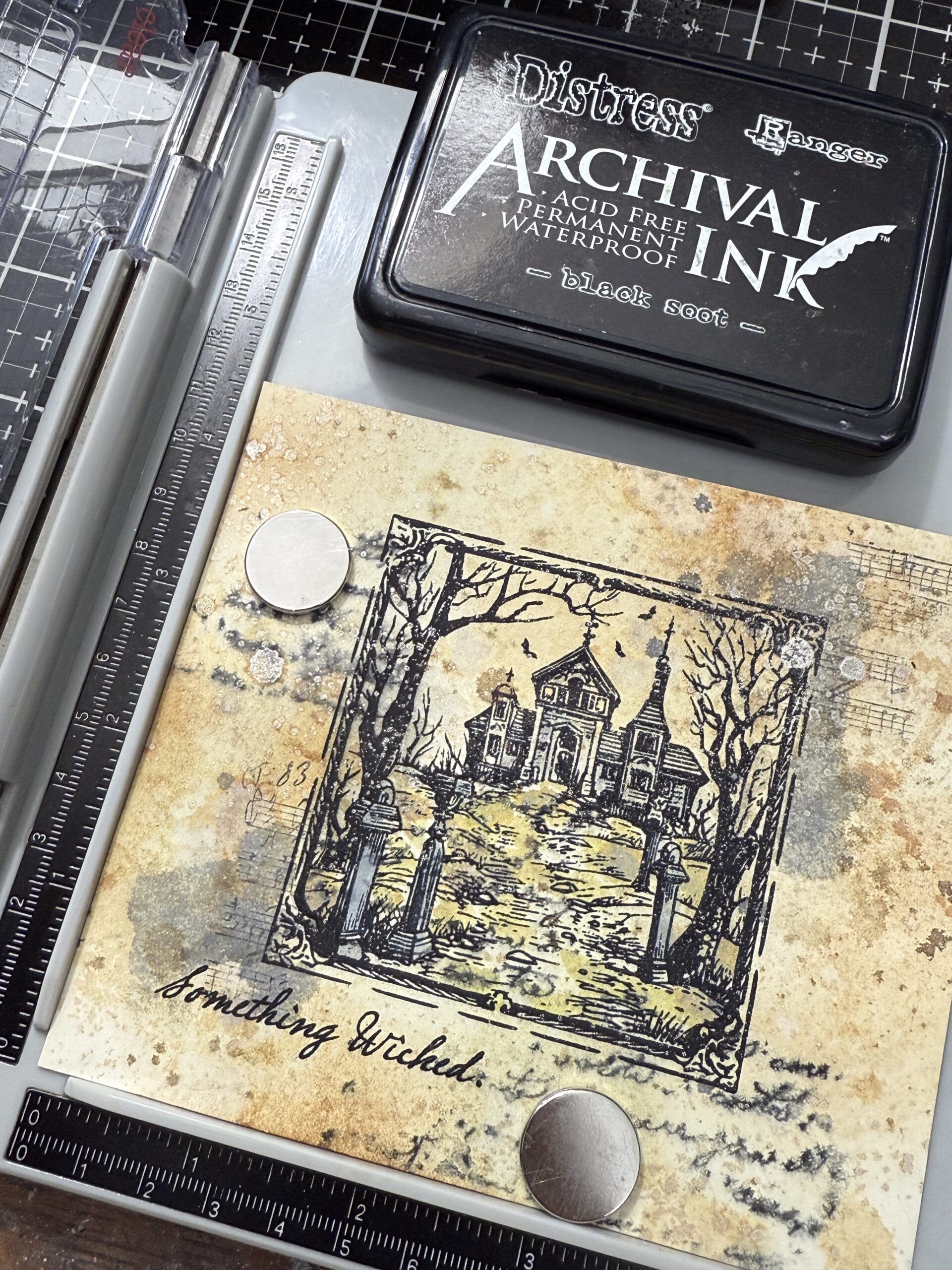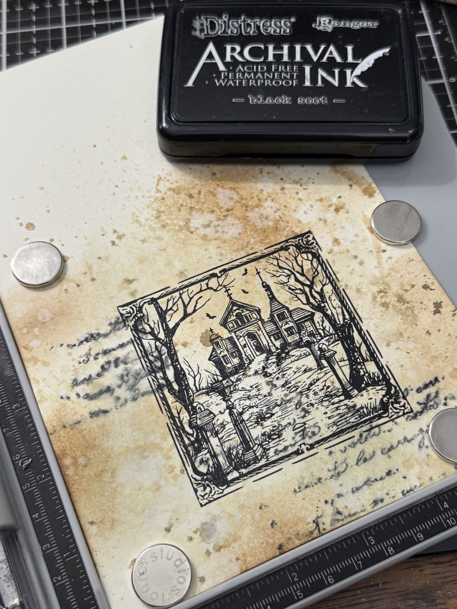 Using my stamp platform, I stamped the Haunted House image onto the paper using Black Soot Archival Distress Ink, leaving the stamped background within the platform.