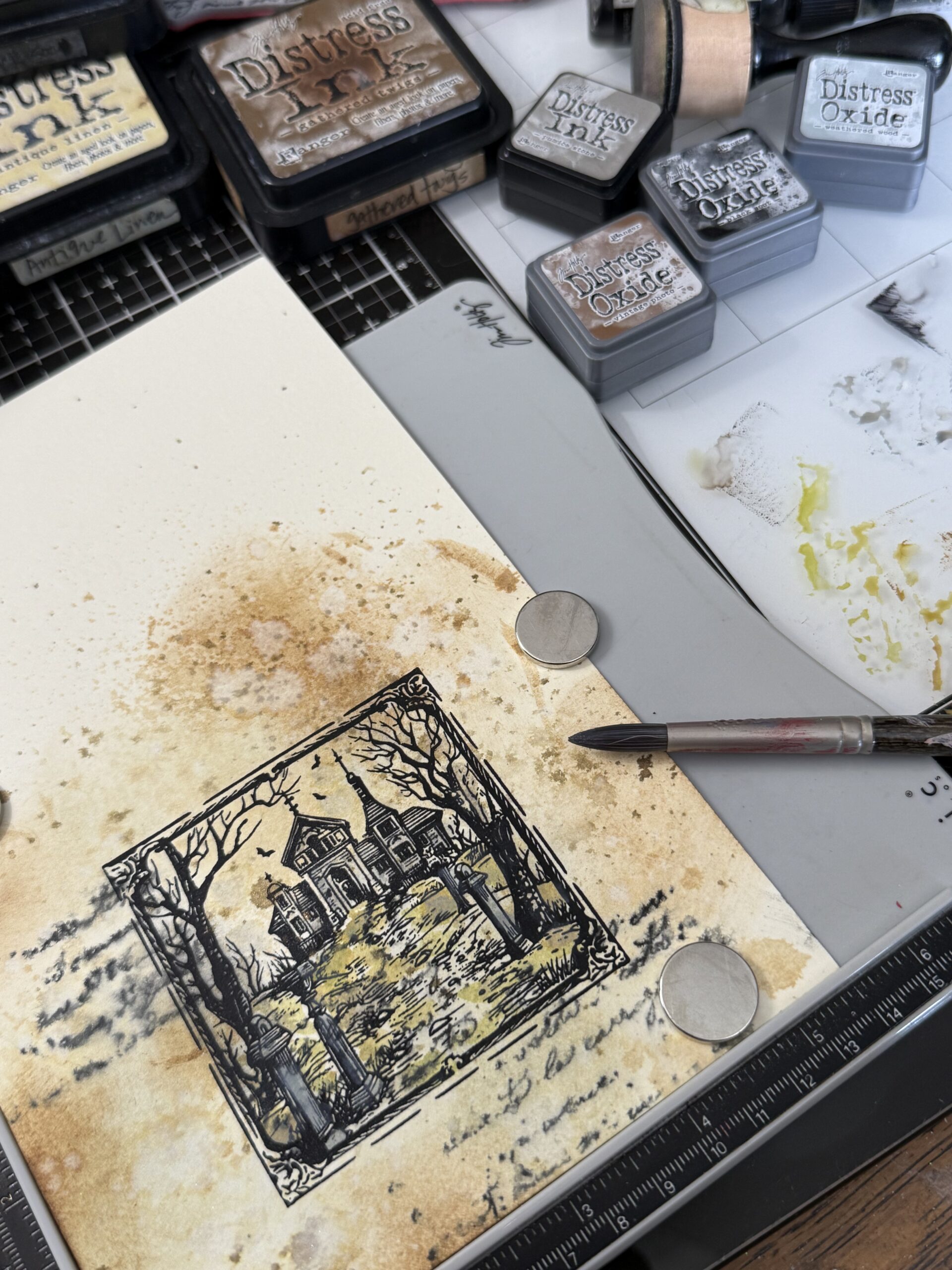 Using a paintbrush, some water and a variety of inks and oxides, I began painting some of the ground leading to the house, and the gate. I smooshed the inks onto my media mat and picked up color, then painted it into the areas. Once I was done coloring I dried it with my heat tool.