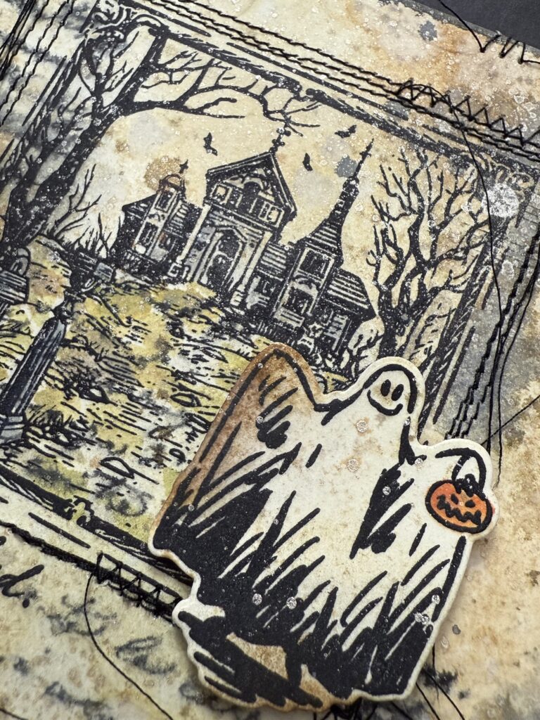 Next, I stamped the ghost image from the Halloween Sketchbook set using Black Soot Archival, then colored him using some ink & mica stain. I dried him ice he was colored up, then cut him out using the new wafer die set. Before adding him to the front of the card using foam adhesive, I stitched around the frame of the Haunted House image using my sewing machine using both straight and zigzag stitches.