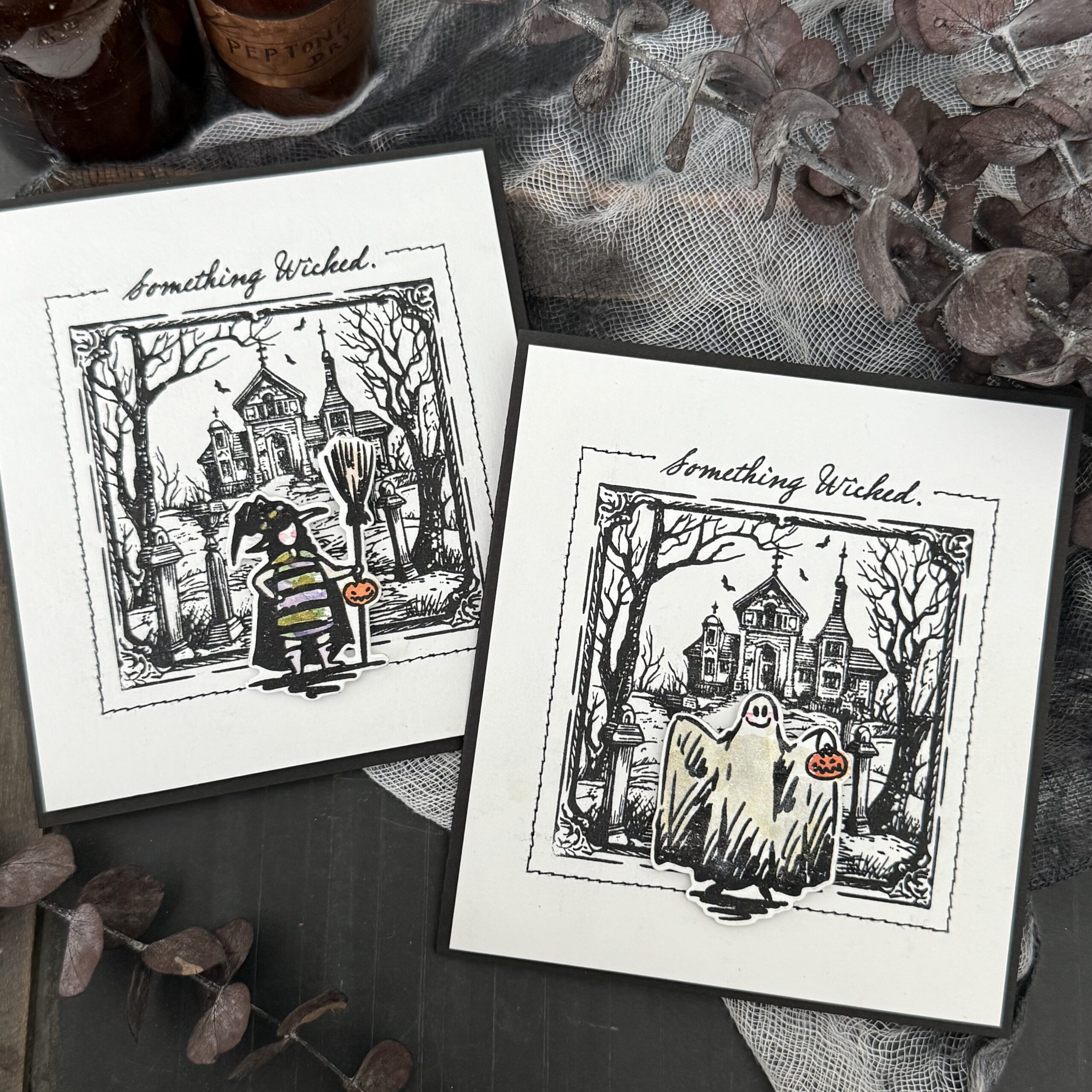 The creepy factor is intense!! lol! Amazing backgrounds. I love how you built the card from last yearโs dies and added the ghost!