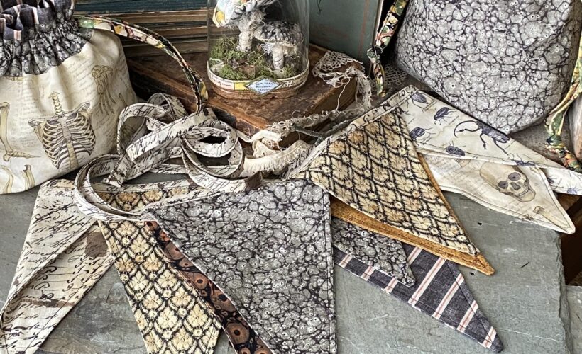 Hello friends! It’s me again! This time, with a Halloween Bunting that I made for the Tim Holtz Halloween Fabric release…it features a collection of the Eclectic Elements Laboratory Collection. The collection is perfectly spooky yet vintage in every good way. The pattern was based on a free Bunting tutorial that I found through Pinterest. The pattern is by amylovestosew.com…