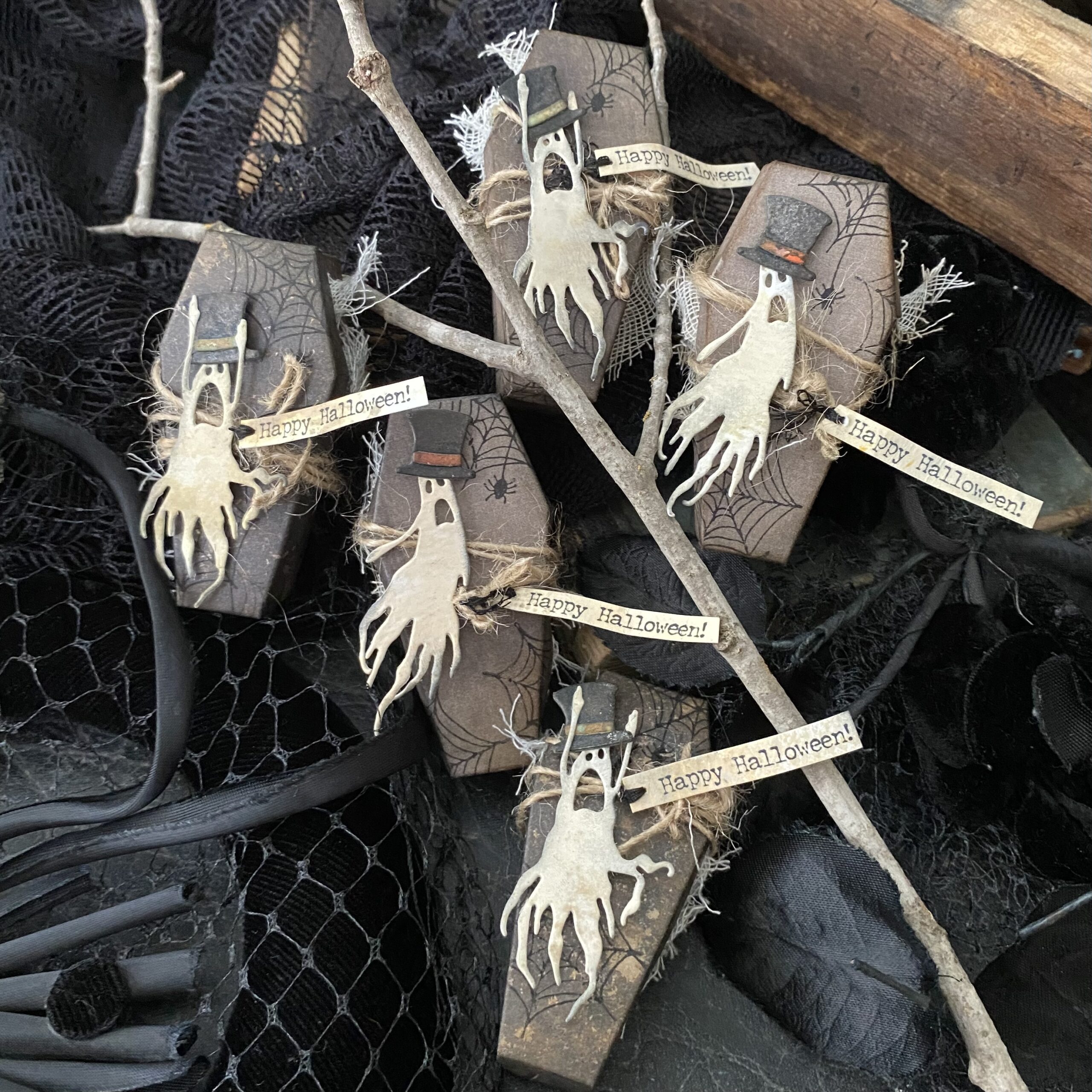 17. BOO Coffin Mini Treat Boxes- (set of 5) These little coffin shaped boxes each feature a dapper little ghost and Happy Halloween tag. The are tied shut using thin jute, but could easily be opened to hold tiny halloween treats or candy, tied to gift bags or strung with string to create small hangable ornaments. – $25 (approx. size 3″x1.5″)
