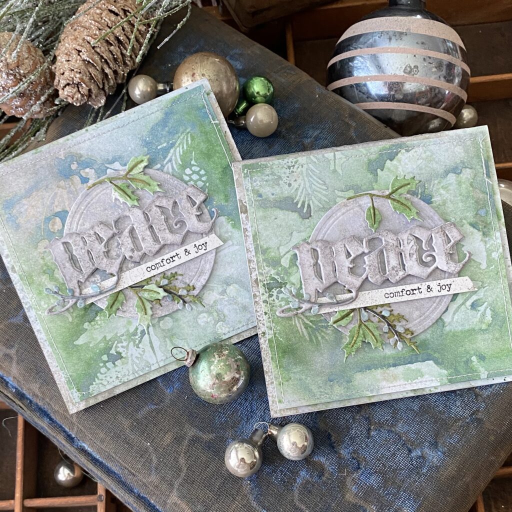 26. Peace, Comfort and Joy- set of 2 cards, featuring inky background papers and little layered holly berries and leaves die cut and layered to create a 3D effect. Machine Stitching around the edges adds to the vintage look of these cards. – $25 (approx. size 4.5″x4.5″)
