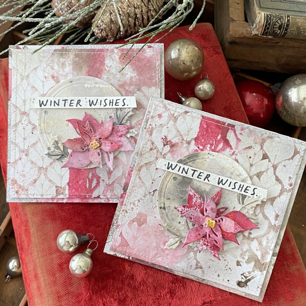 25. Winter Wishes – set of 2 cards, featuring inky background papers and little layered poinsettias die cut and layered to create a 3D effect. Machine stitching around the edges of the cards adds to the vintage look of these cards. – $25 (approx. size 4.5″x4.5″)