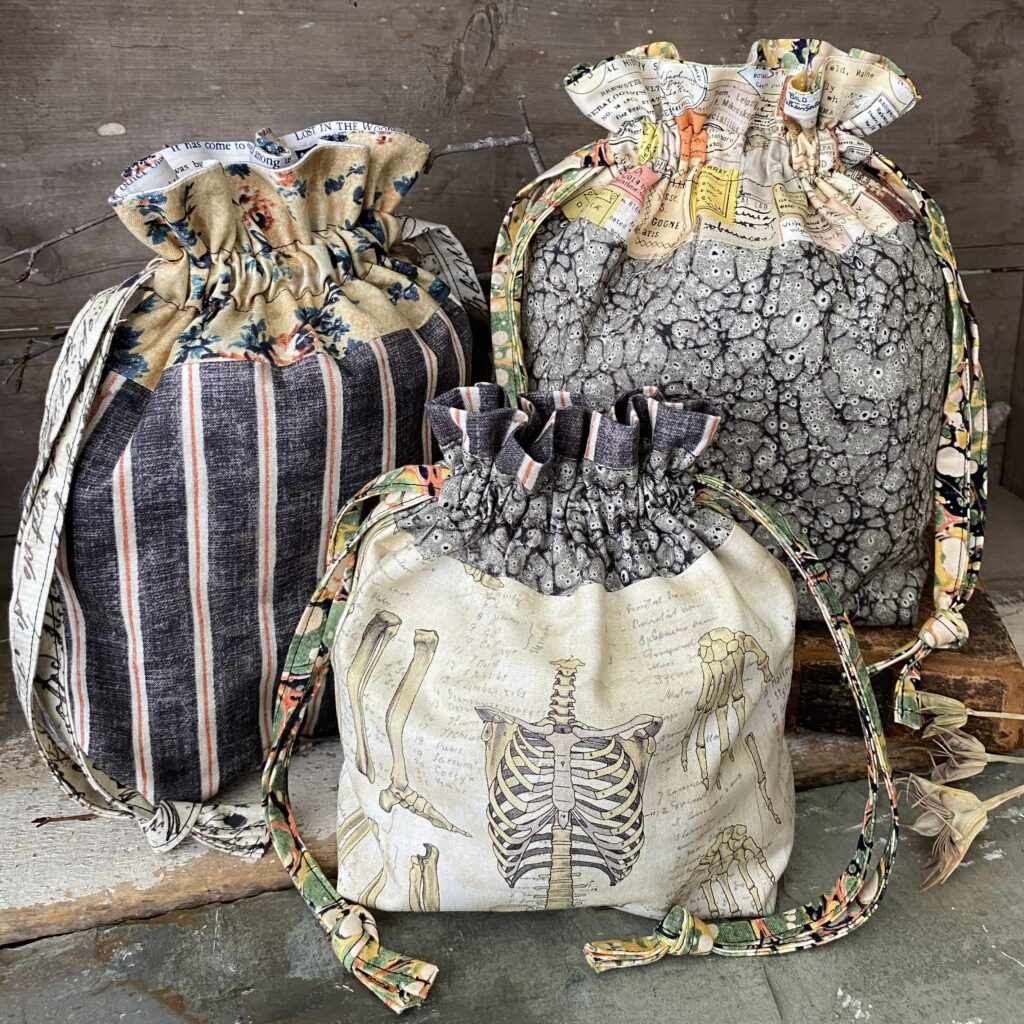 13. Set of Halloween Treat Bags – These are machine stitched drawstring bags made for gift wrapping, treat bags or anything you can imagine them for. They were made using the 2024 Tim Holtz Halloween Eclectic Elements Fabric collection. – Sold as set – $55 . (approx. size large 10″x 9.5″ and small 8″x 8″)