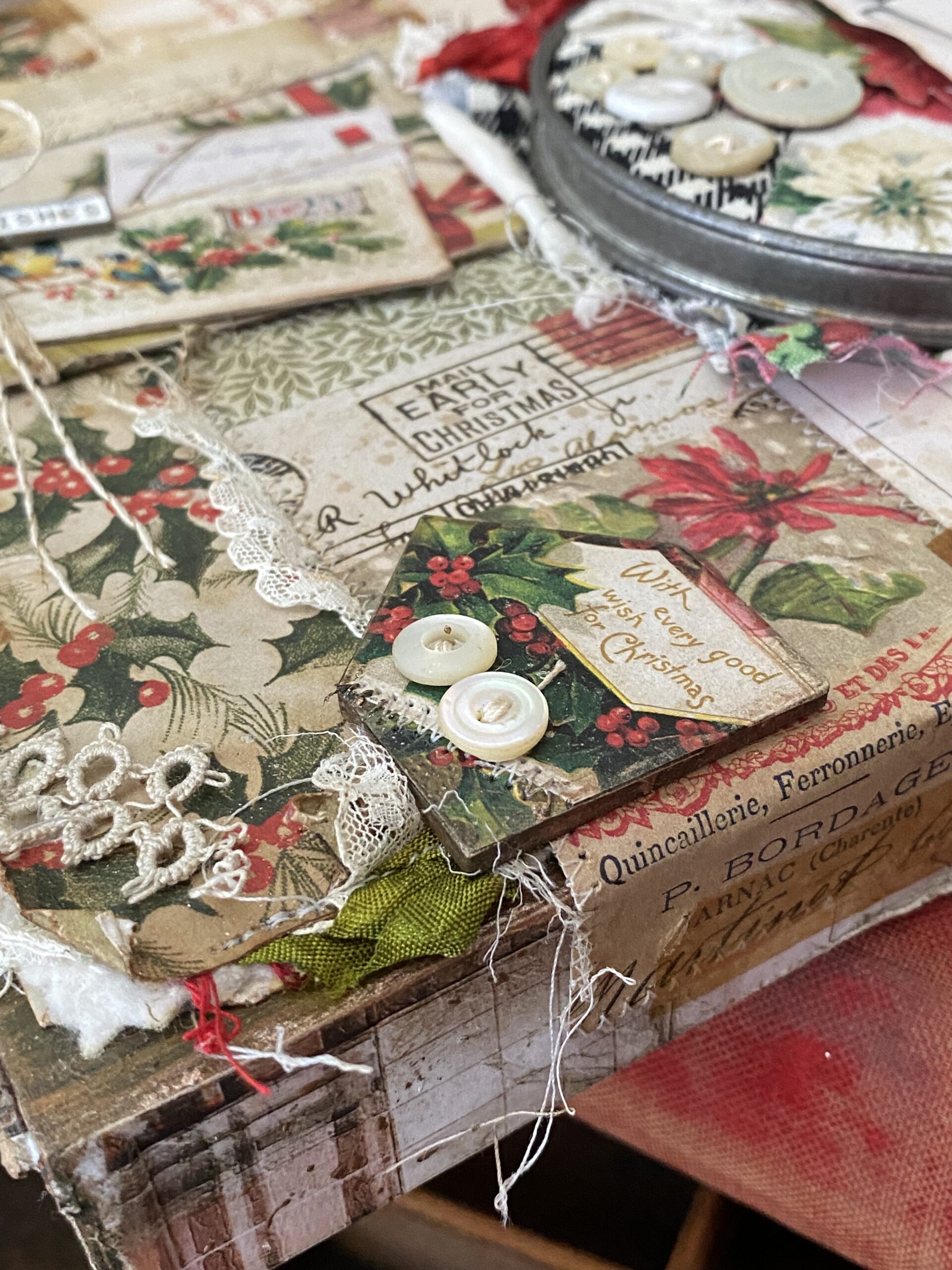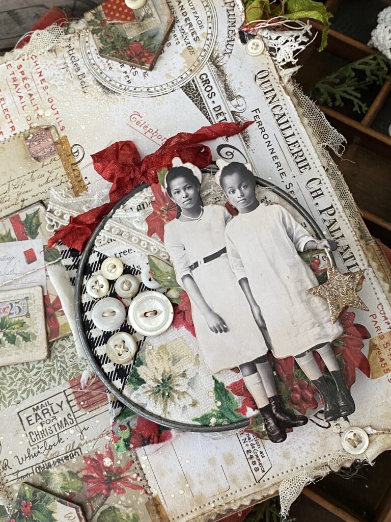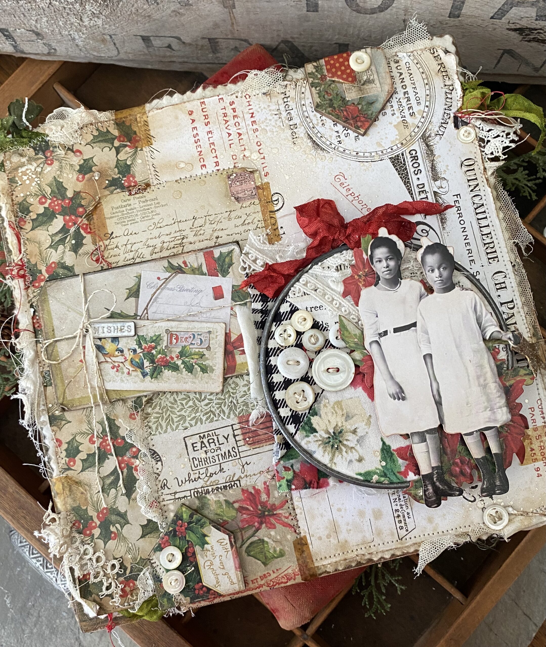 24. Merry Christmas to you- A Large Square Vignette Display Panel featuring Tim Holtz idea-ology Christmas embellishments, layers of distressed papers, inky ephemera and stitchy bits and vintage buttons. Hand dyed ribbons, vintage lace and strings. Sewing details featured using Tim Holtz Christmas fabrics and a small grungy embroidery hoop adorned with lots of vintage buttons and a paper doll cutout featuring two adorable girls. Layered up for a beautiful hanging display for your wall or placed on a shelf for display. – $135 (approx. size 9″x9″)