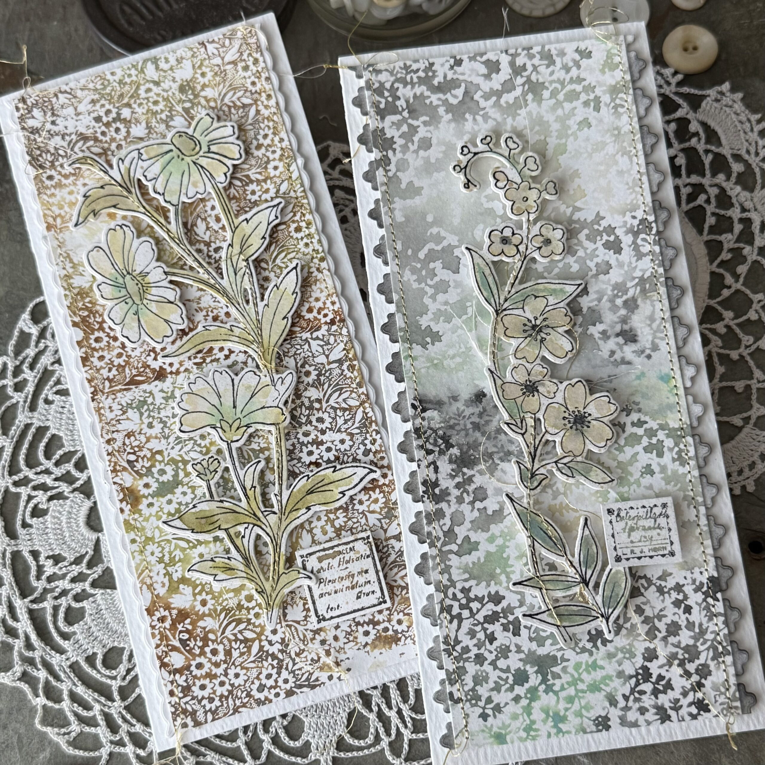 8. Ditzy Print Cards – Set of 2 hand stamped, watercolored die cut and stitched cards. – $25 (approx. sizes 3.5″x 6.5″)
