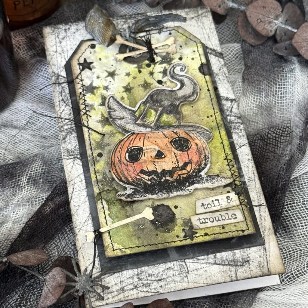 14. Pumpkin Head Card- A Halloween Card using the Tim Holtz Pumpkinheads Stamp Set. This card measures approximately 4″x5″ and features inky papers, Embossed and Paper Punched Stars, stitching and a die cut spider and bones for embellishments. – $15 (3.25″x5.25″)