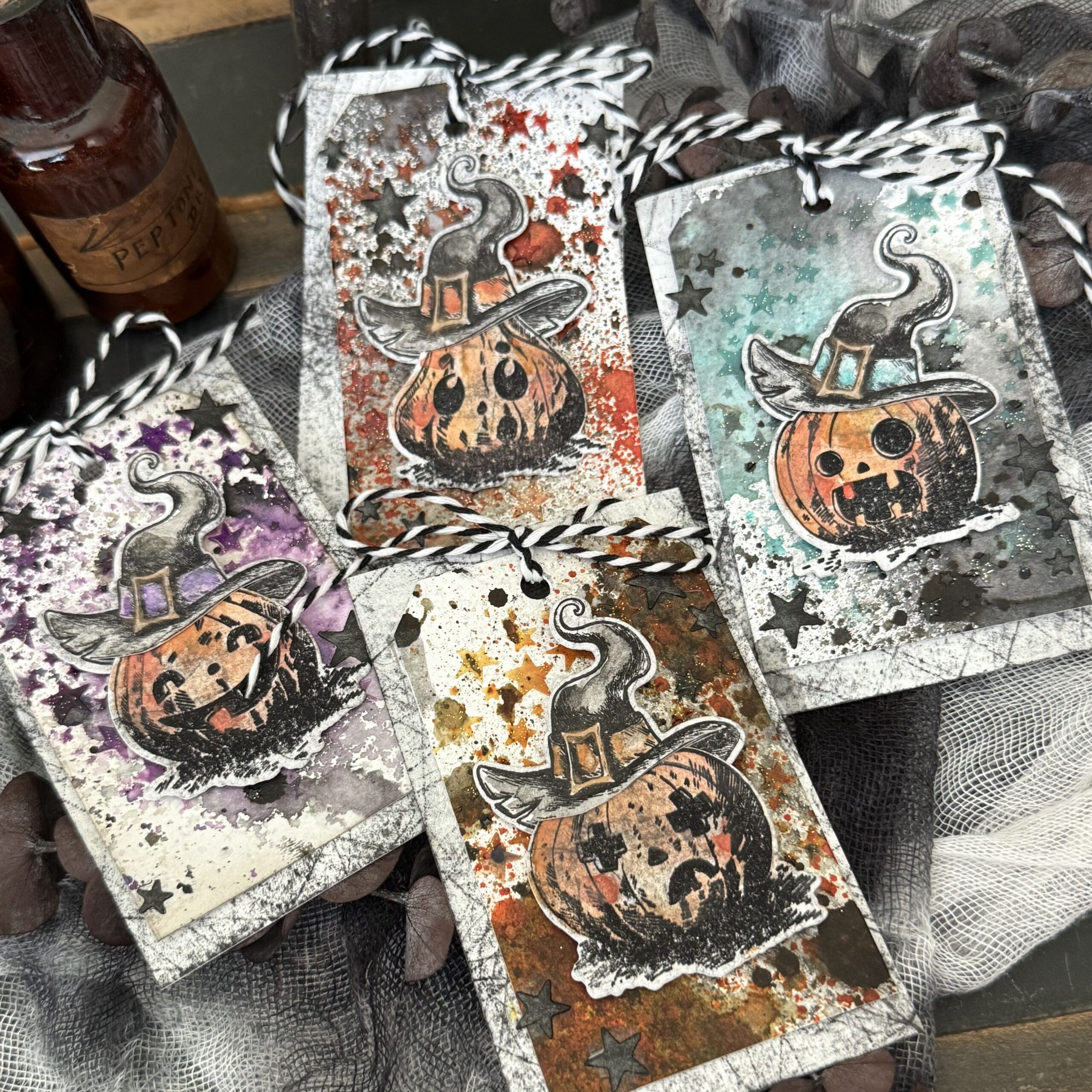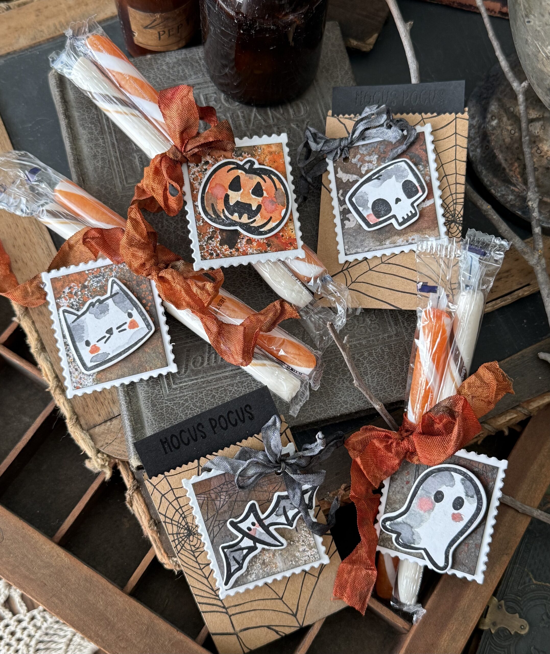 19. Tie On Trick or Treat tags and gift card mini bags- more inky background papers and watercolored images, die cut then embellished with hand dyed ribbons, are all featured on these tags…they even come with the halloween candy sticks. – $25 (approx. size tags 1.25″x1.5″ envelopes 2.5″x3.25″)