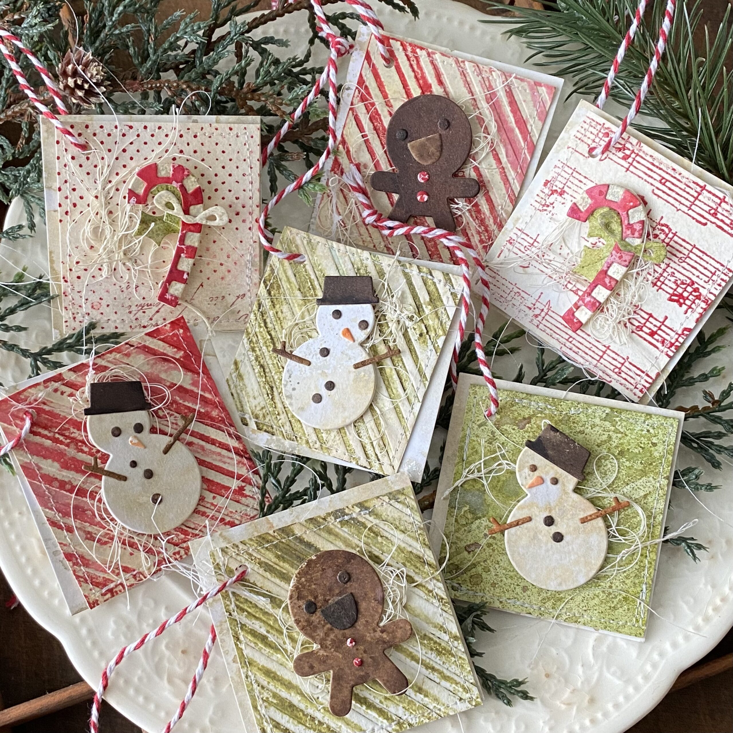 27. Shabby & Cute Mini Christmas Tags- featuring tiny Christmas shapes cut from inky papers, adhered together and embellished onto inky hand stamped and textured papers. Stitchy bits and strings embellish each of these tiny tags making them perfect for gift giving tied up with string. Set of 7 – $25 (approx. size 2.25″x2.25″)