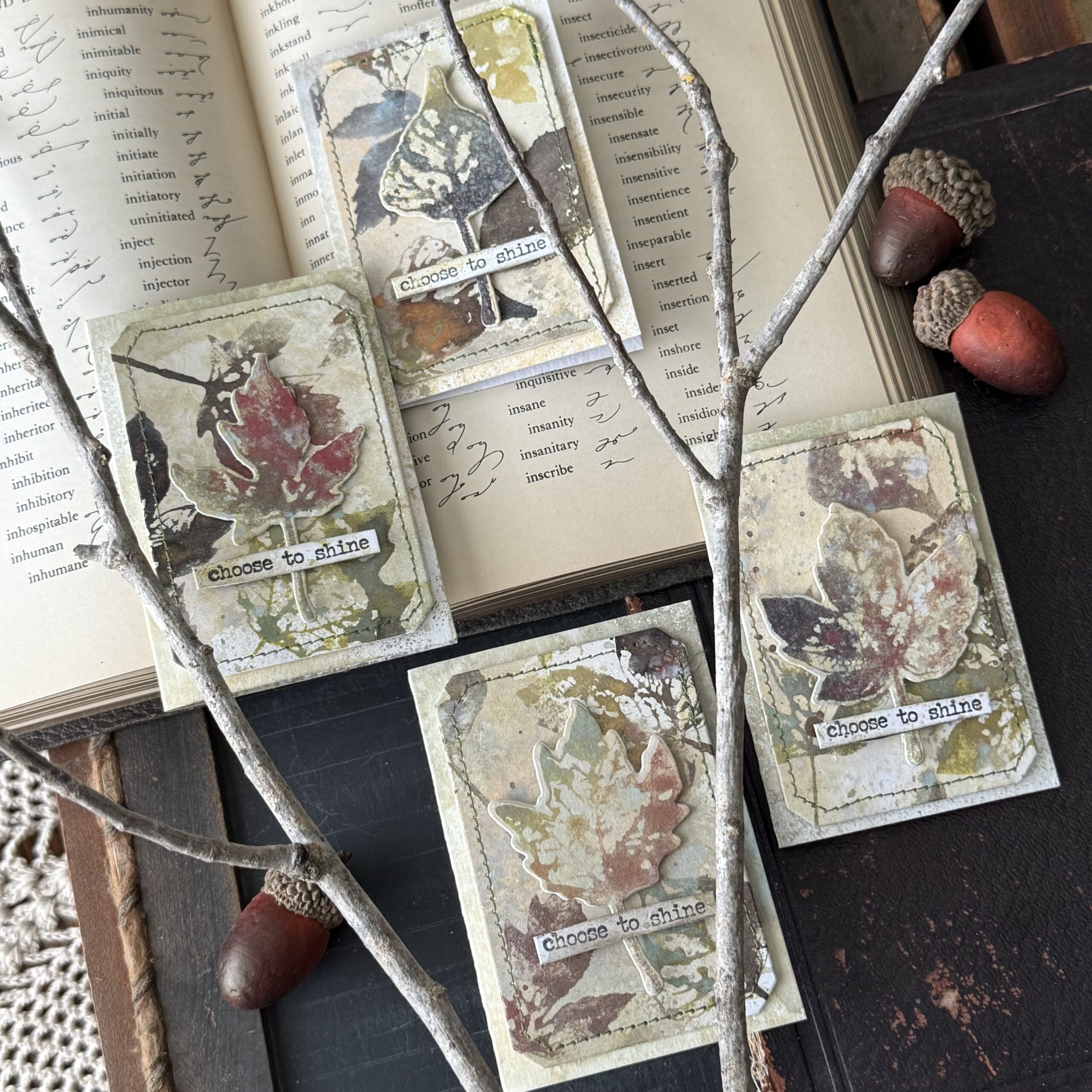 22. Choose to Shine Mini Cards- set of 4 mini cards featuring inky leaves stamped using leaf stamps and matching die cuts. – $20 (approx. size 2.5″x3.25″)