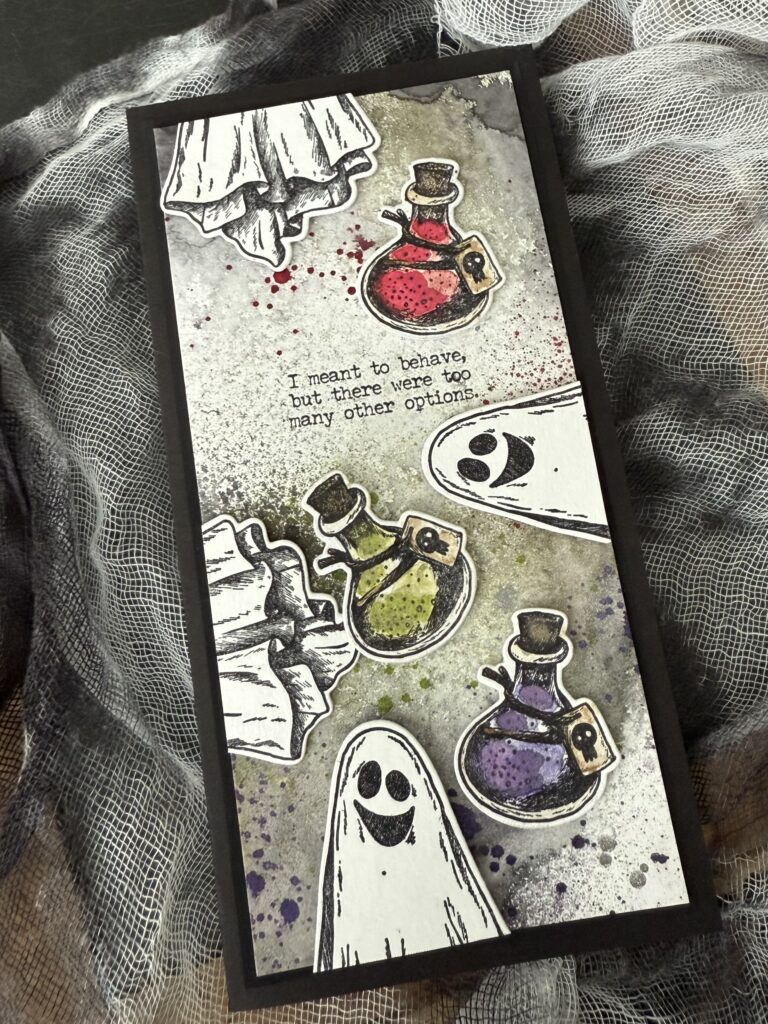 18. Silly Ghost Card- Inky background papers, stamped and die cut ghosts decorate this card. – $15 (approx. size 3.5″x6″)