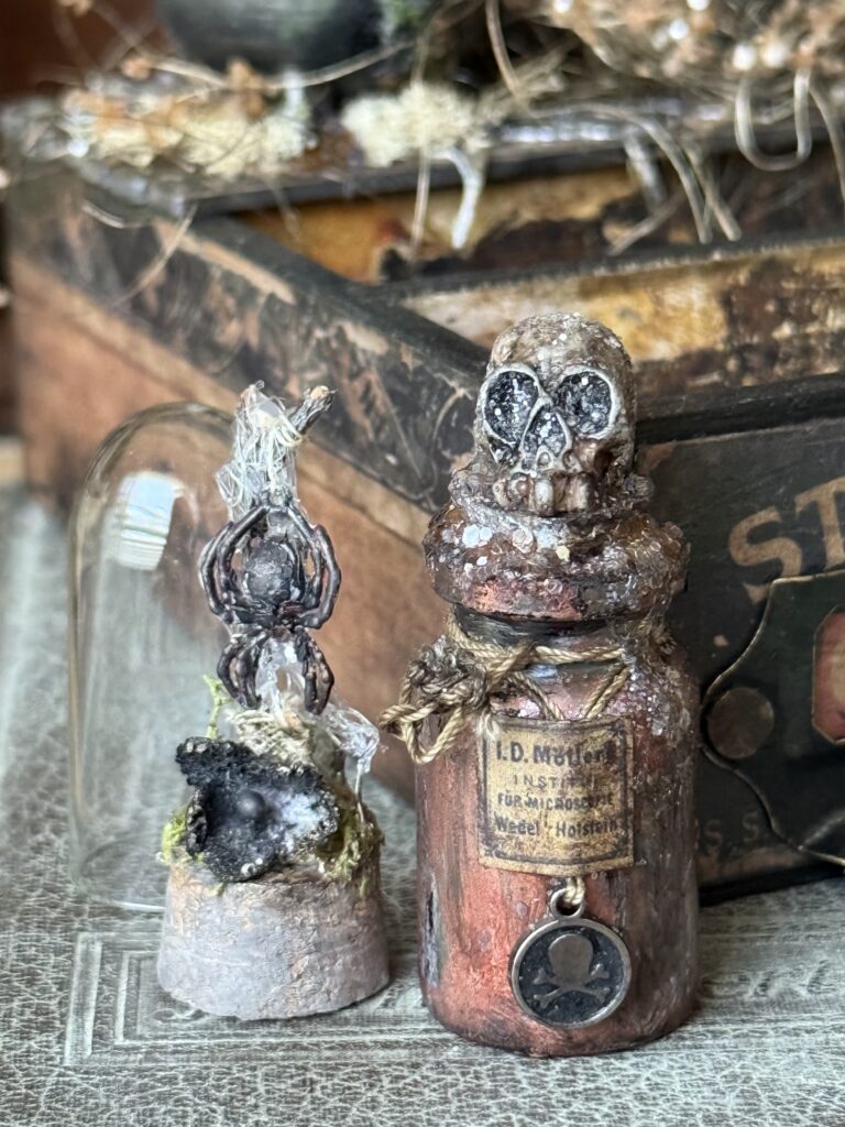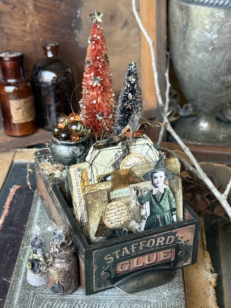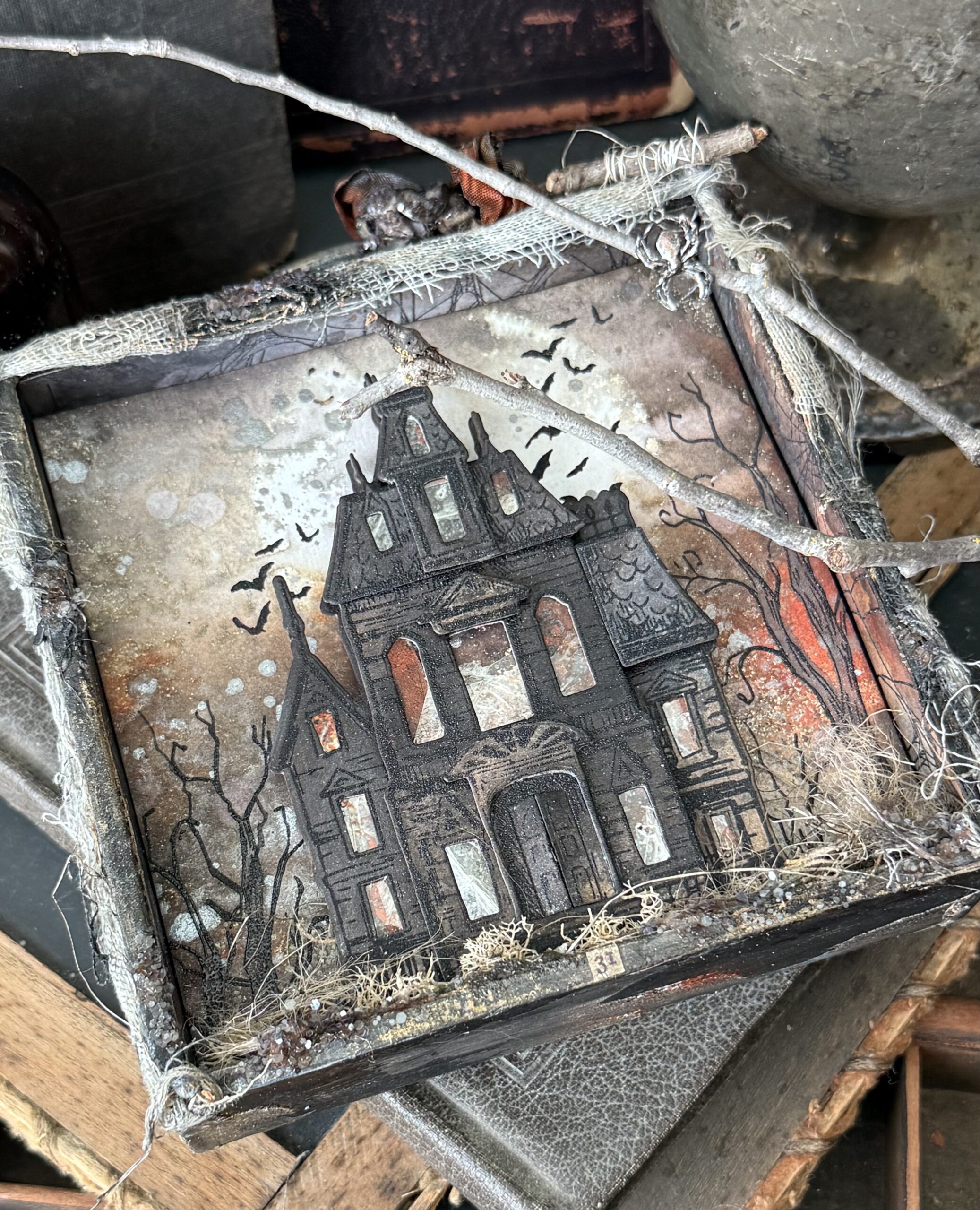 12. Things that go Bump in the NIght- A Haunted House Vignette- featured on my blog September 2025, please click HERE to see additional photos. This vignette was created using new dies from Tim Holtz and Simon Says Stamp. It features layers of inky die cut pieces, broken mica tiles for windows and was created within a Large idea-ology Square Vignette. Inky handmade papers, ribbons, mummy cloth, a creepy spider hanging from a found stick and drawer pull add to the vintage feel of the piece. It’s sure to add a victorian creepiness to your Halloween decor. – $125 (approx. size 5.5″x5.5″)