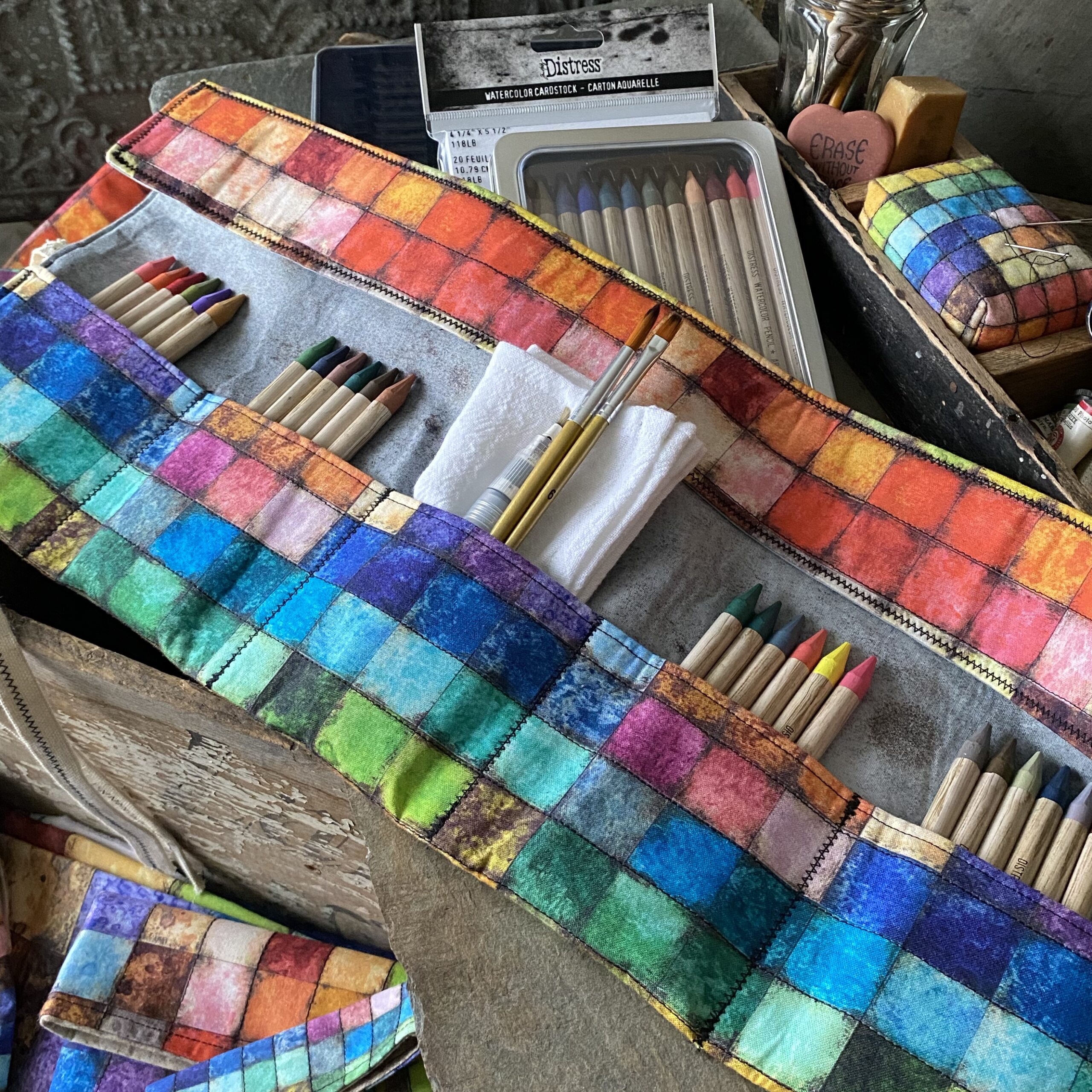 9. Handmade Watercolor Pencil Roll- This was made for the release of the Tim Holtz Colorblock Fabric release. It features 5 pockets that can be used to hold 2 sets of Distress Watercolor Pencils (as seen in photo) or used to hold regular length watercolor or colored pencils. In the 2nd photo below, you can see where I have place watercoloring tools (a paintbrush, water brush and cotton towel) in the center pocket. A cotton tie is attached to be used to tie the roll for storage or travel. – $40 (does not include pencils or supplies as shown in photo)