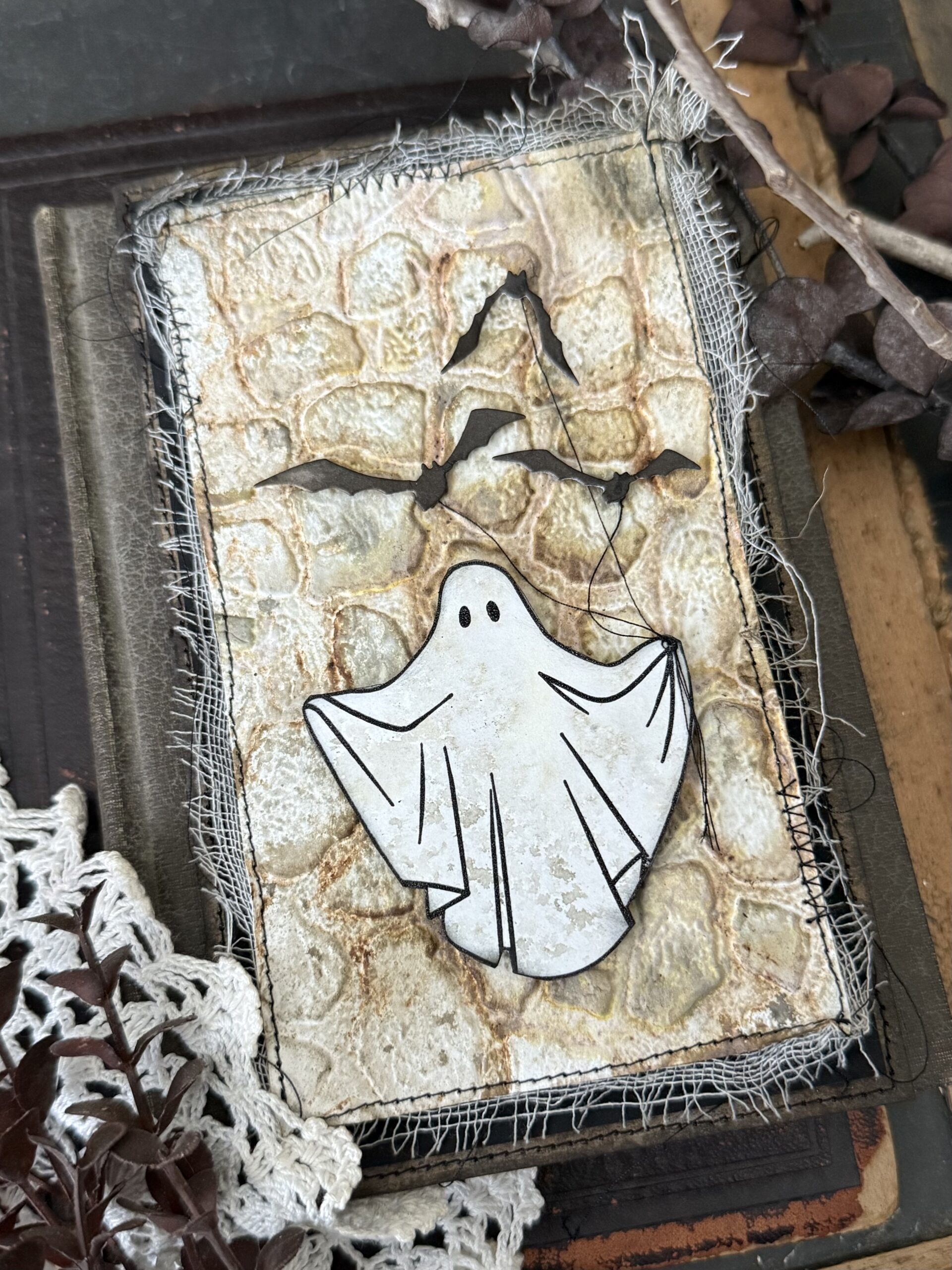 20. Boo-tiful Ending Halloween Card – Featuring layered textured papers created using 3D embossing folders and inks and a ghost with a few of his batty friends. – $15 (approx. size 3.5″x 6″)