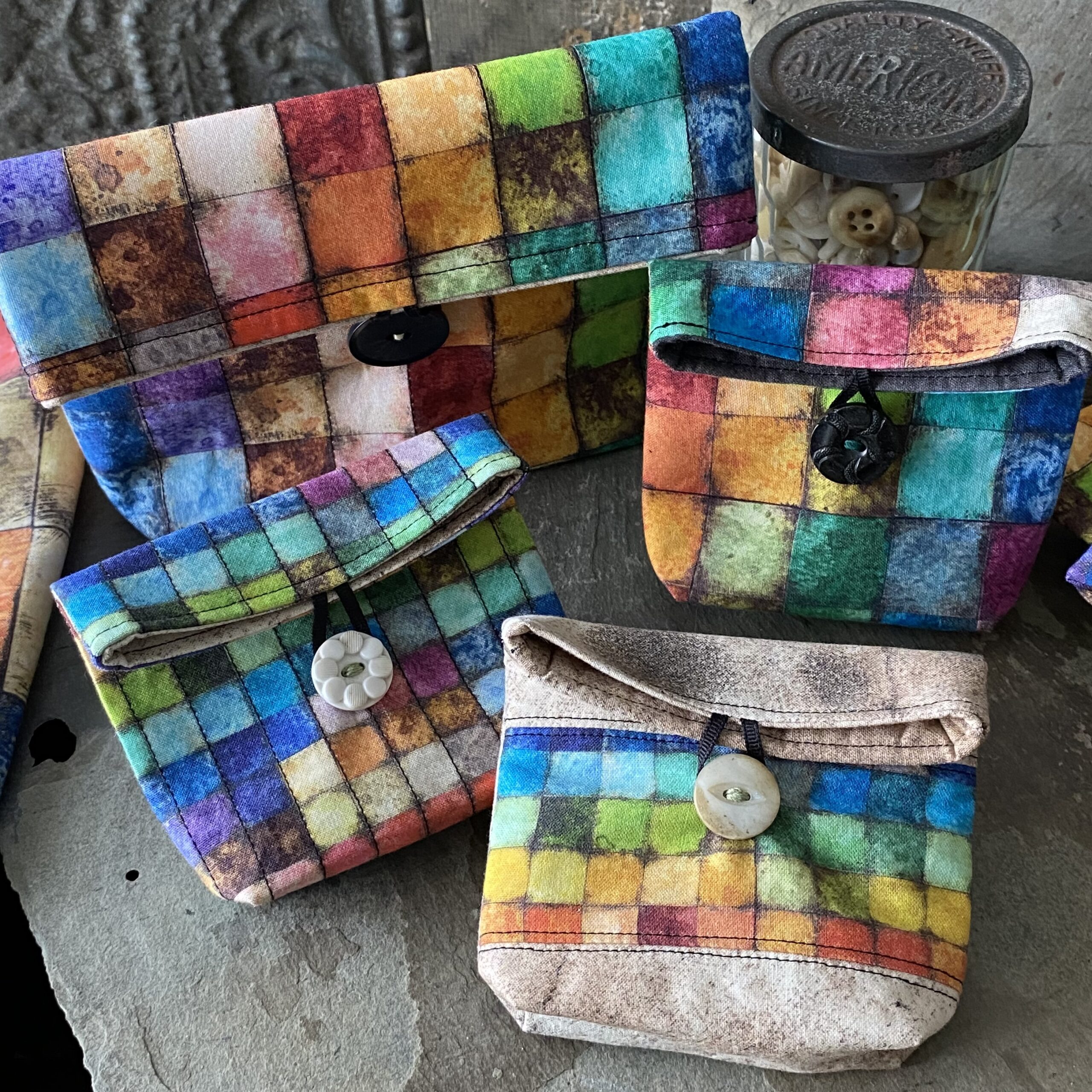 11. Colorblock Storage Pouches- Set of 4 storage pouches made from Tim Holtz Colorblock fabric – perfect for storing supplies, pocket change or items in a purse. All pouches feature a vintage button for the closures. -$35 (approx. size large 5″x 4″ small 3.5″x4″)