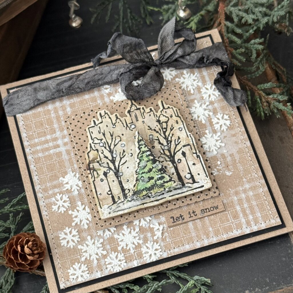 30. Christmas in the City – A card featuring layered die cut pieces, gathered and embellished hand stamped papers, layered using foam tape and embellished using sparkle texture paste. – $15 (approx. size 5″x5″)