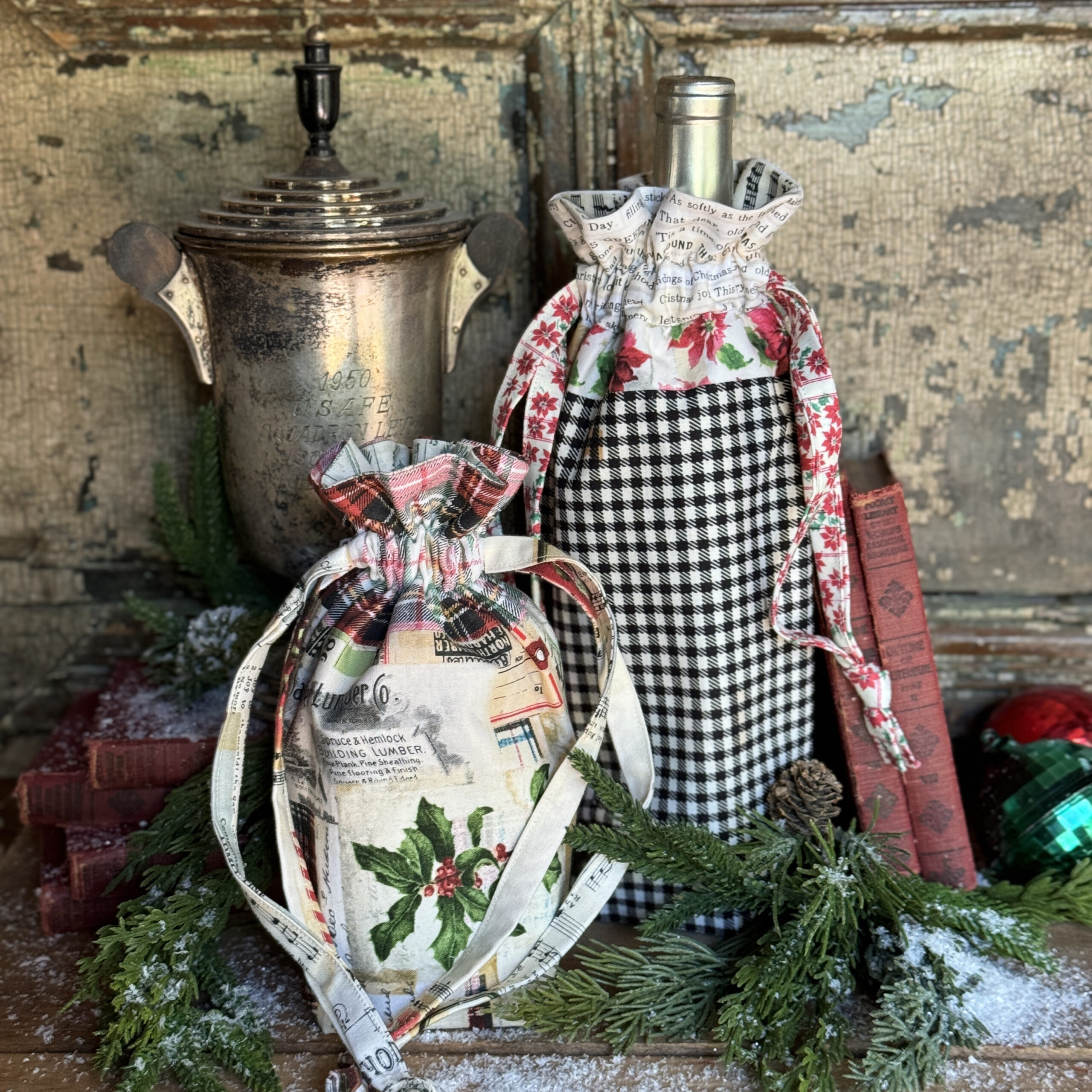 33. Christmas Drawstring Bags – set of 2 sizes- Drawstring bags sewn to size for a small wine or champagne bottle and the smaller size for liquor. Perfect for gift giving! – $40