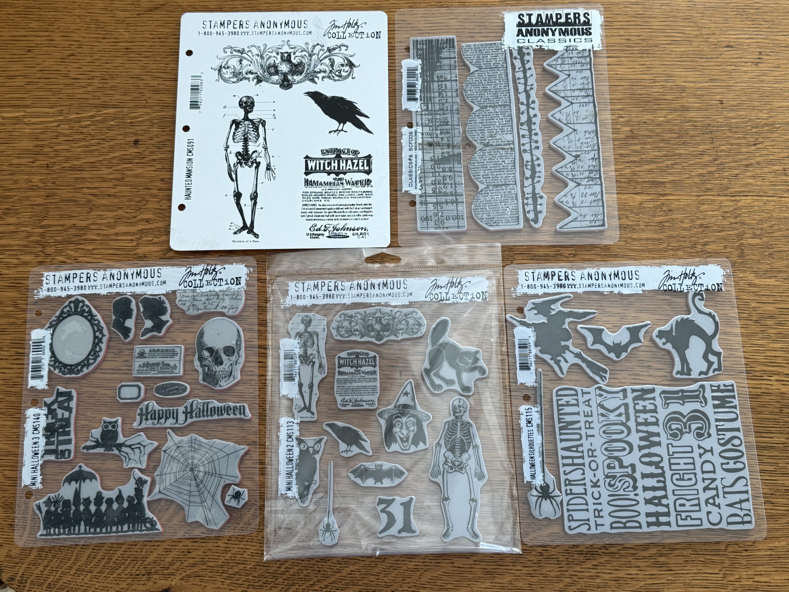 35. Halloween Stamp Sets- New or Gently Used Stamp Sets which include 5 stamp sets… Haunted Mansion cms091, Classics #6 scf006, Mini Halloween 3 cms140, Mini Halloween 2 cms113, Halloween Silhouettes cms115. – all sets sold together for $55. (retail value is $135)