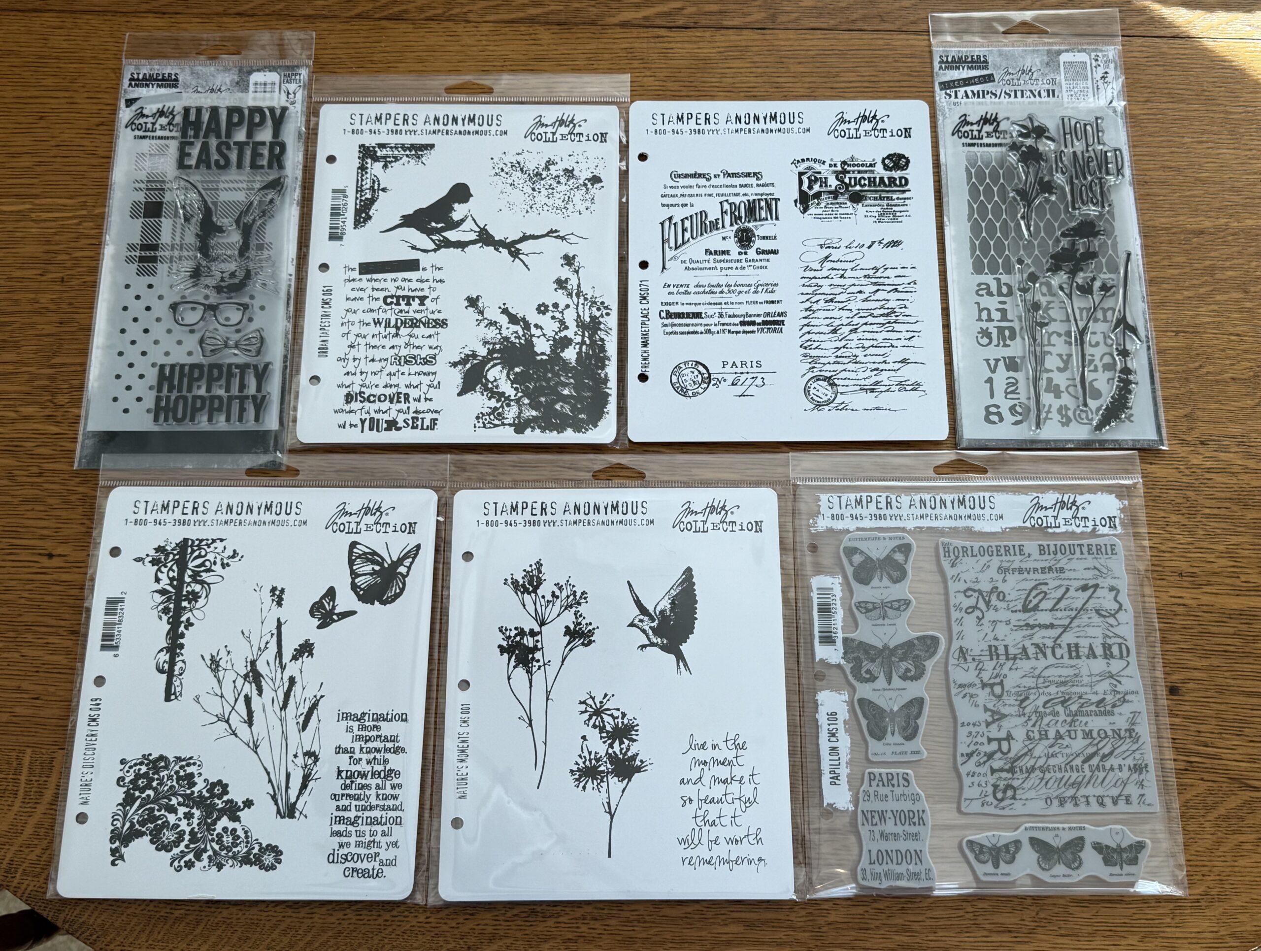 34. Spring and Floral Stamp and Stencil Sets – New or Gently used stamp and stencil sets which include 7 sets… Hipster Bunny Clear Stamps and Stencil thmm164, Wildflower Silhouettes Stamps and Stencil thmm159, Urban Tapestry cms061, French Marketplace cms071, Nature’s Discovery cms049, Nature’s Moments cms001, and Papillion cms106 – all sets sold together for $65. (retail value is $155)