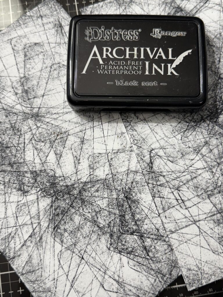 I started by creating a background paper to use as the paper I was going to stamp the pumpkinseeds and watercolor on, so it needed to be a permanent color, I rubbed Black Soot Archival Ink onto a piece of Distress Watercolor Paper (smooth side) then dried it with my heat tool.