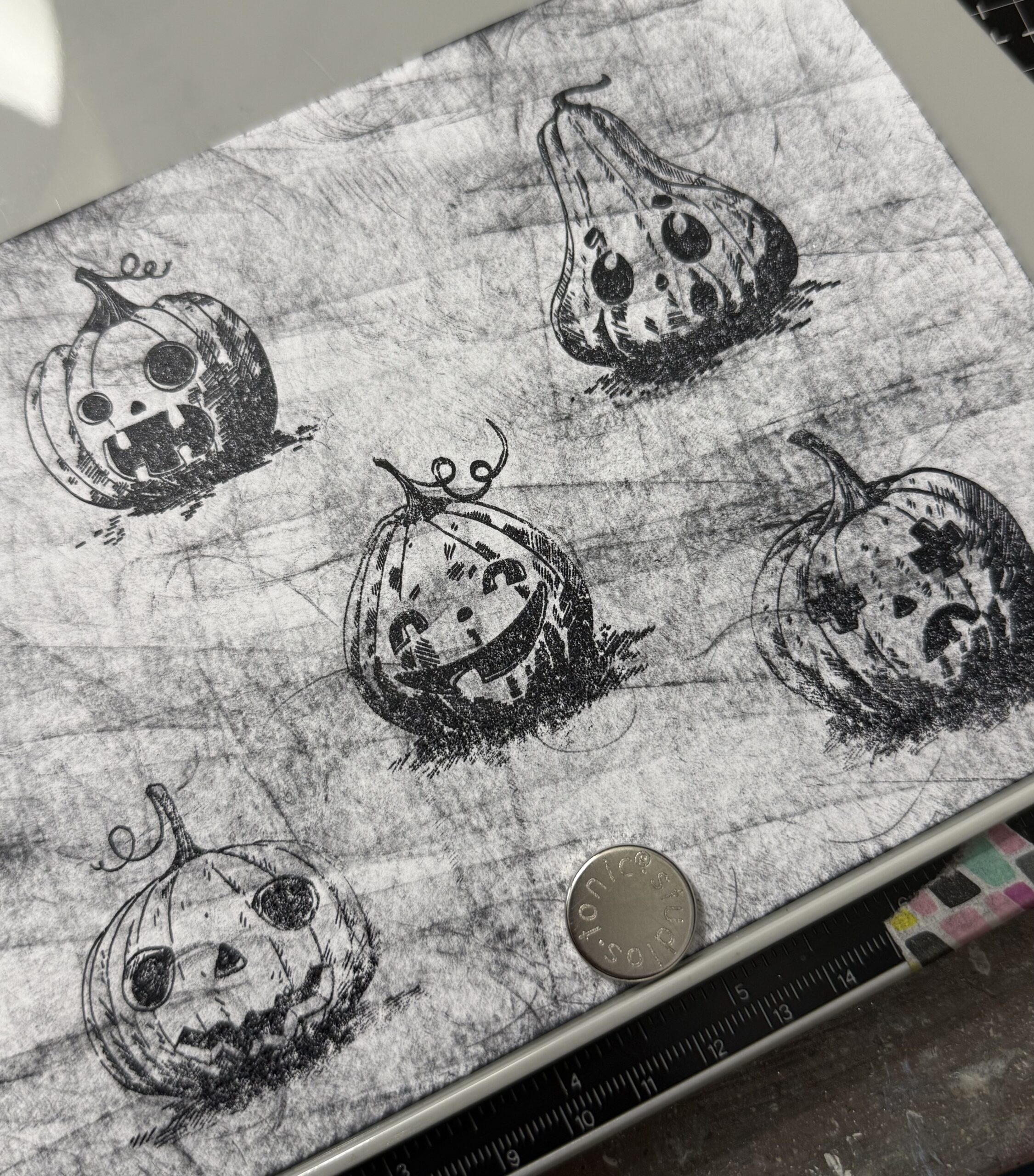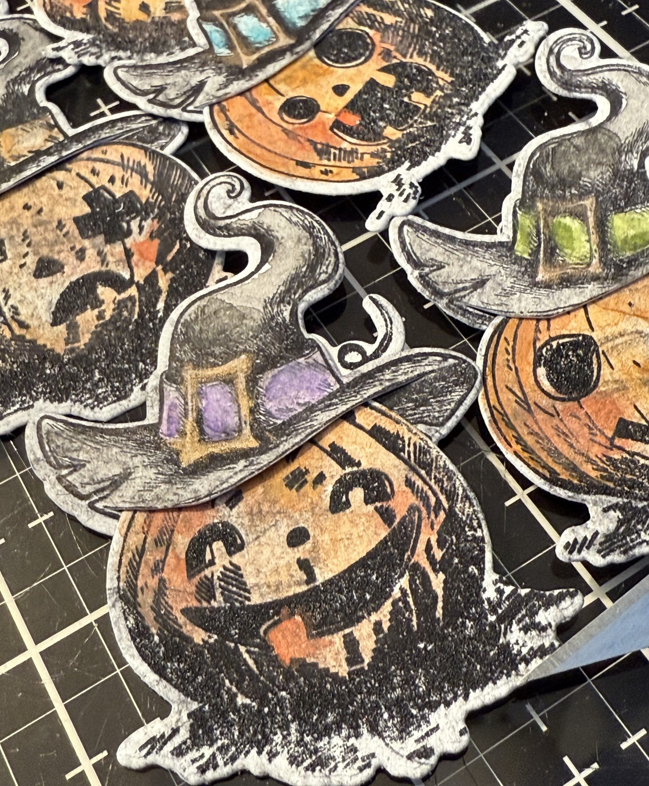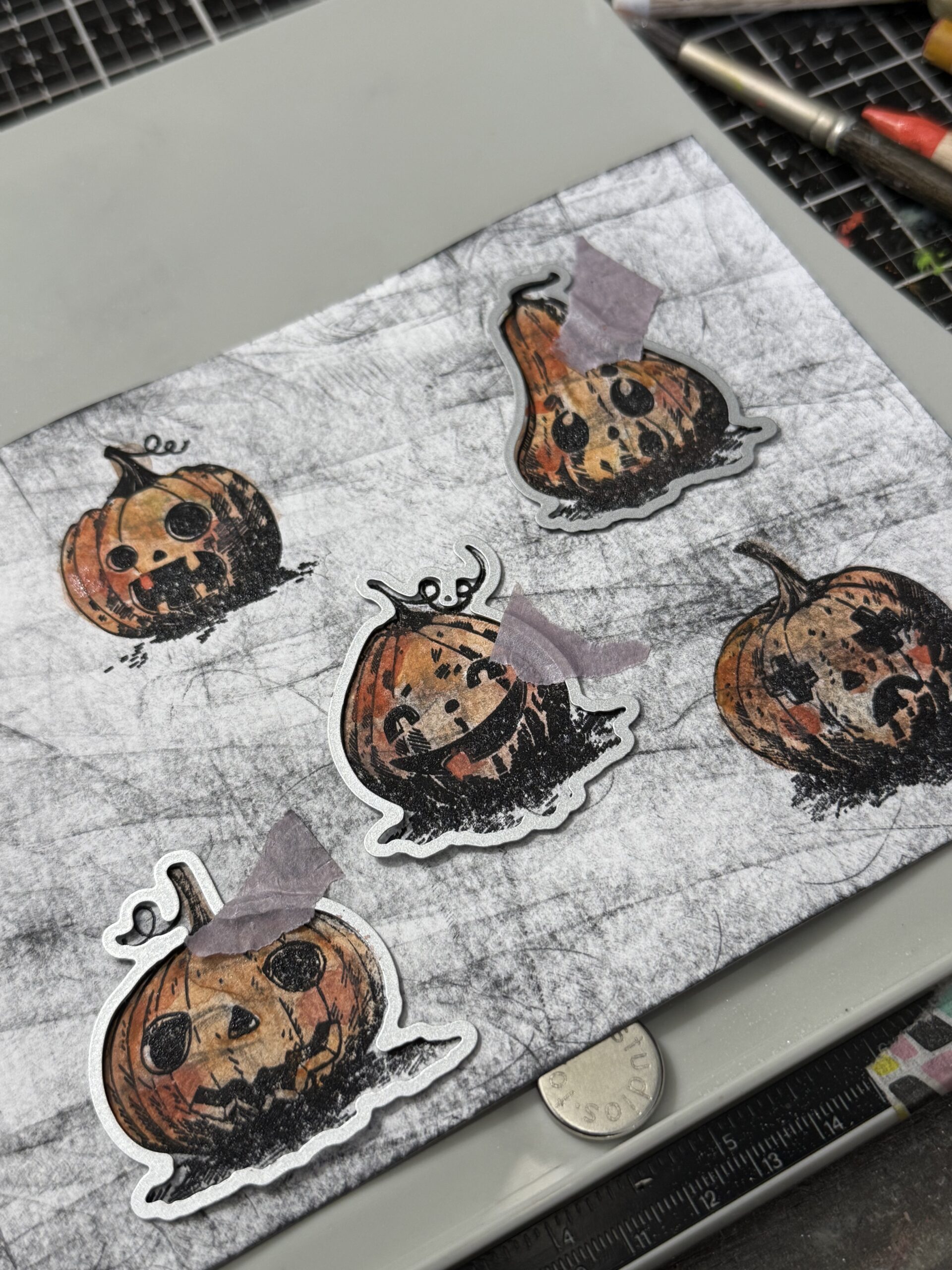 Once the images were colored I used the Pumpkinhead wafer dies to cut out each of the pumpkins. To keep the dies in place, I used low tack tape to keep them in place when I ran them through Sizzix Machine.