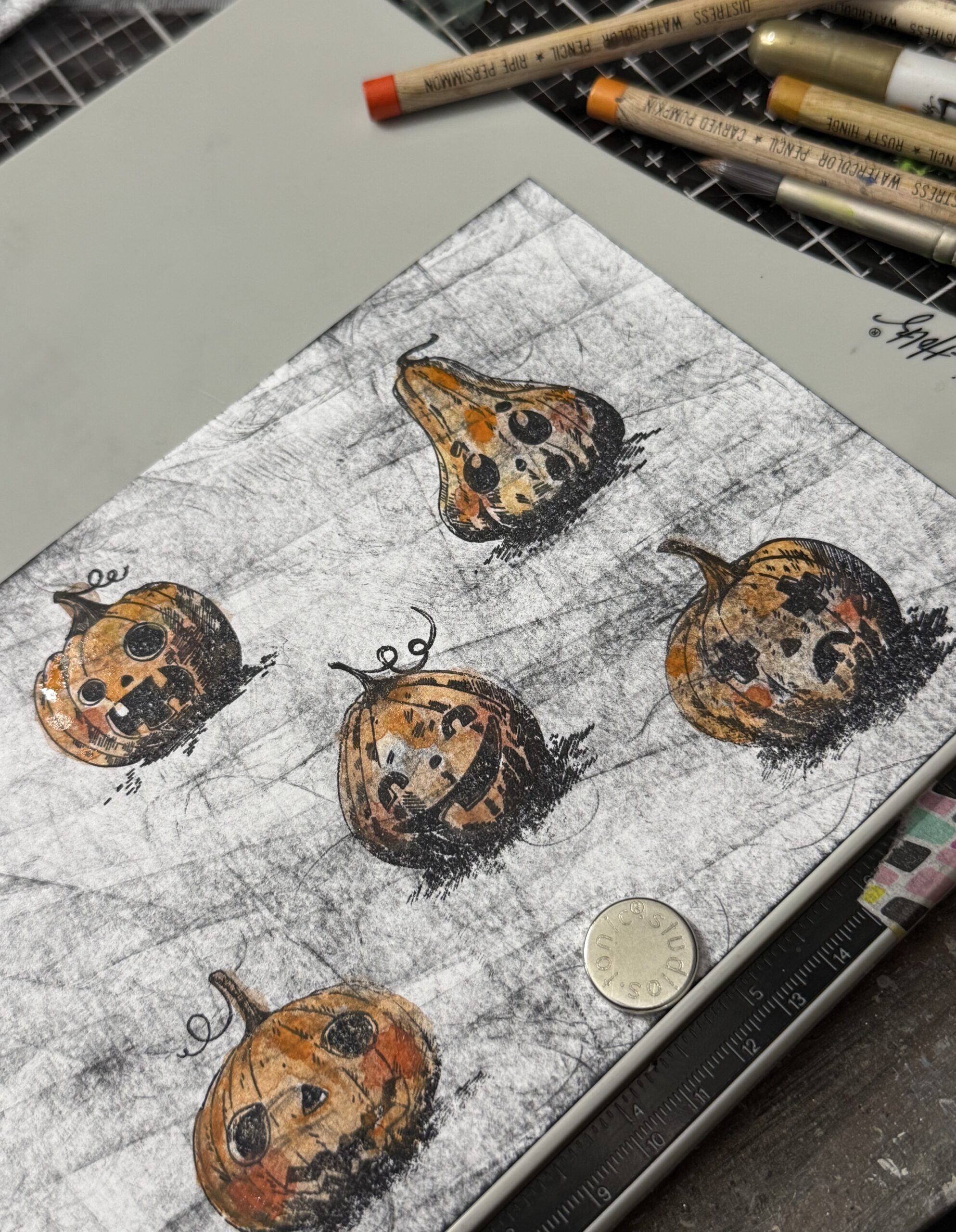 I stamped the pumpkin images onto the paper using Black Soot Archival Ink and my Stamping Platform so that I could restamp them and make them dark. I left the paper inside the platform, then colored the images using Distress Watercolor Pencils.