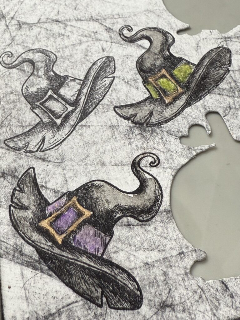 I stamped the witch hat from the Halloween Doodles Stamp Set and matching wafer die set. I stamped the images on scraps of the same paper, then colored the hats and in the same way as I had the pumpkins.