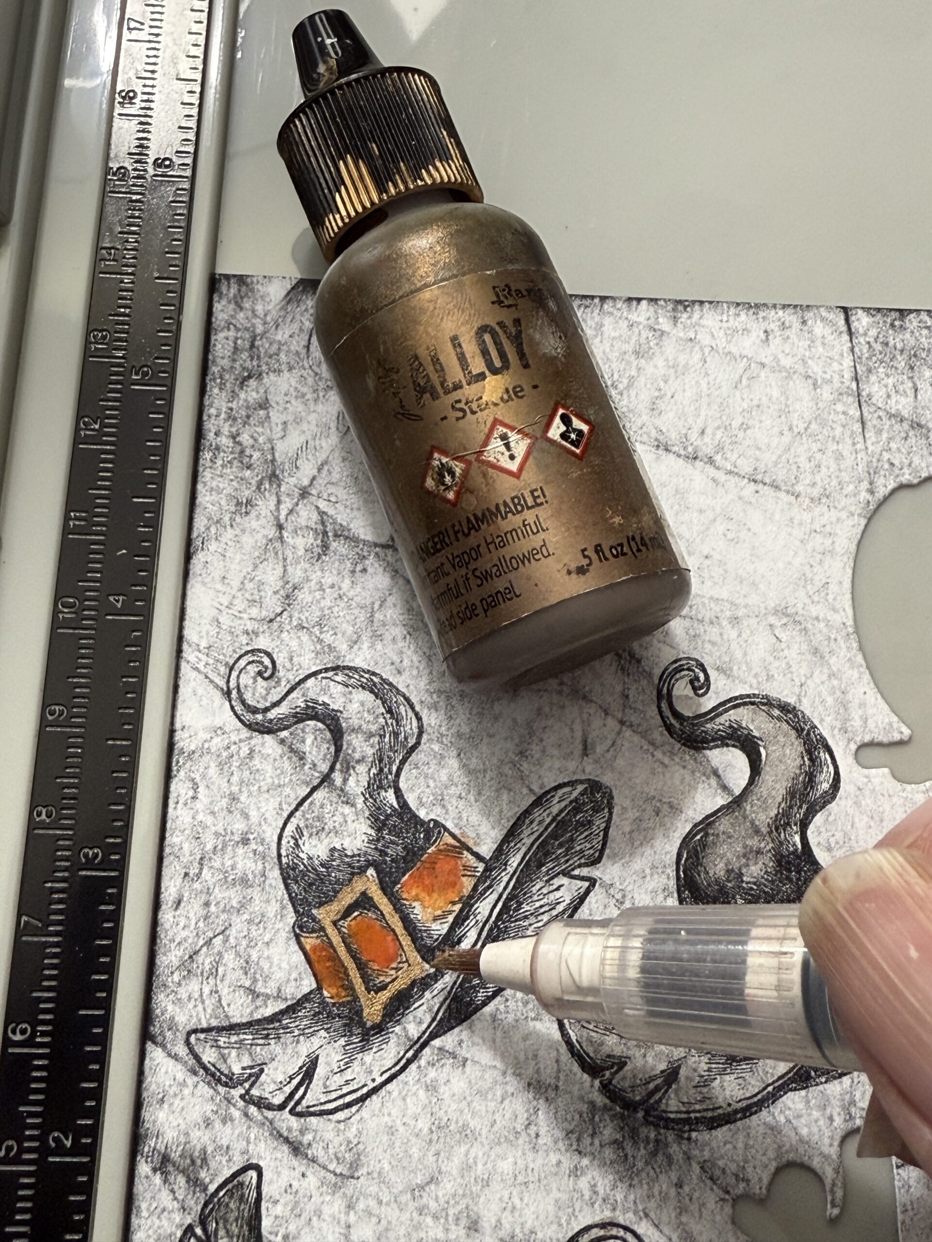 I used a bit of statue Alcohol Ink to color the buckle on the hat, then restamped the image a few times with Black Soot Archival Ink until the image was crisp.