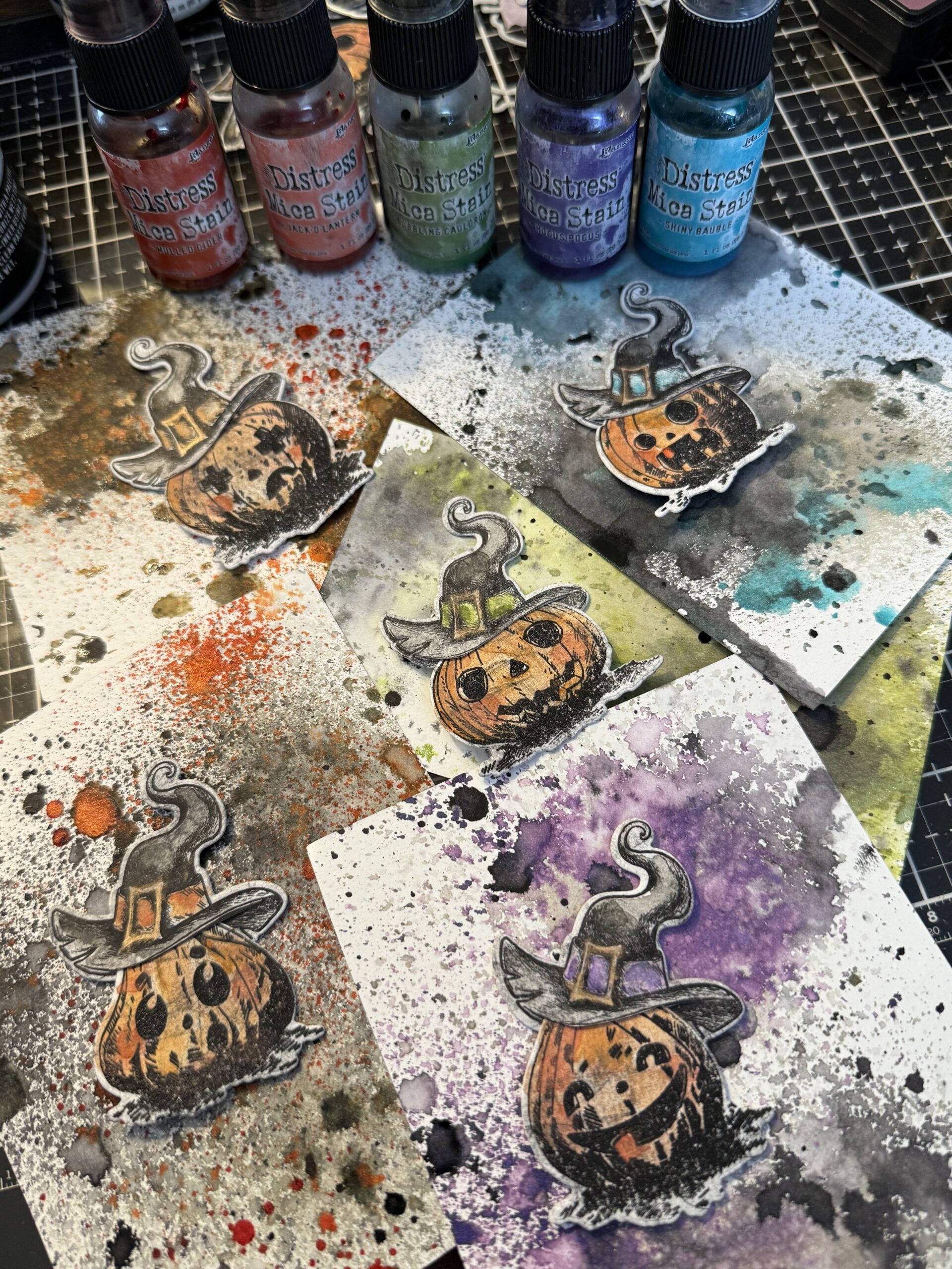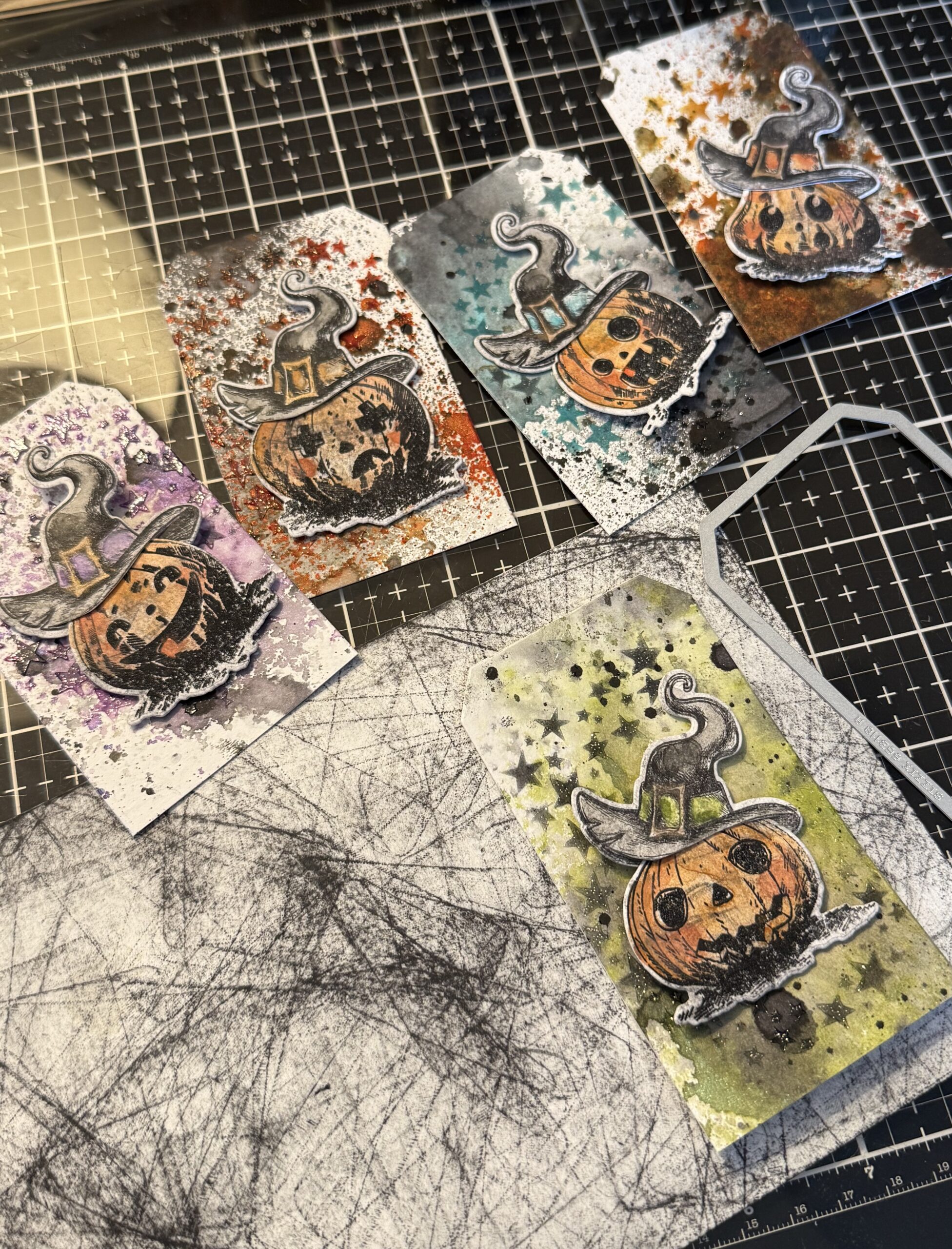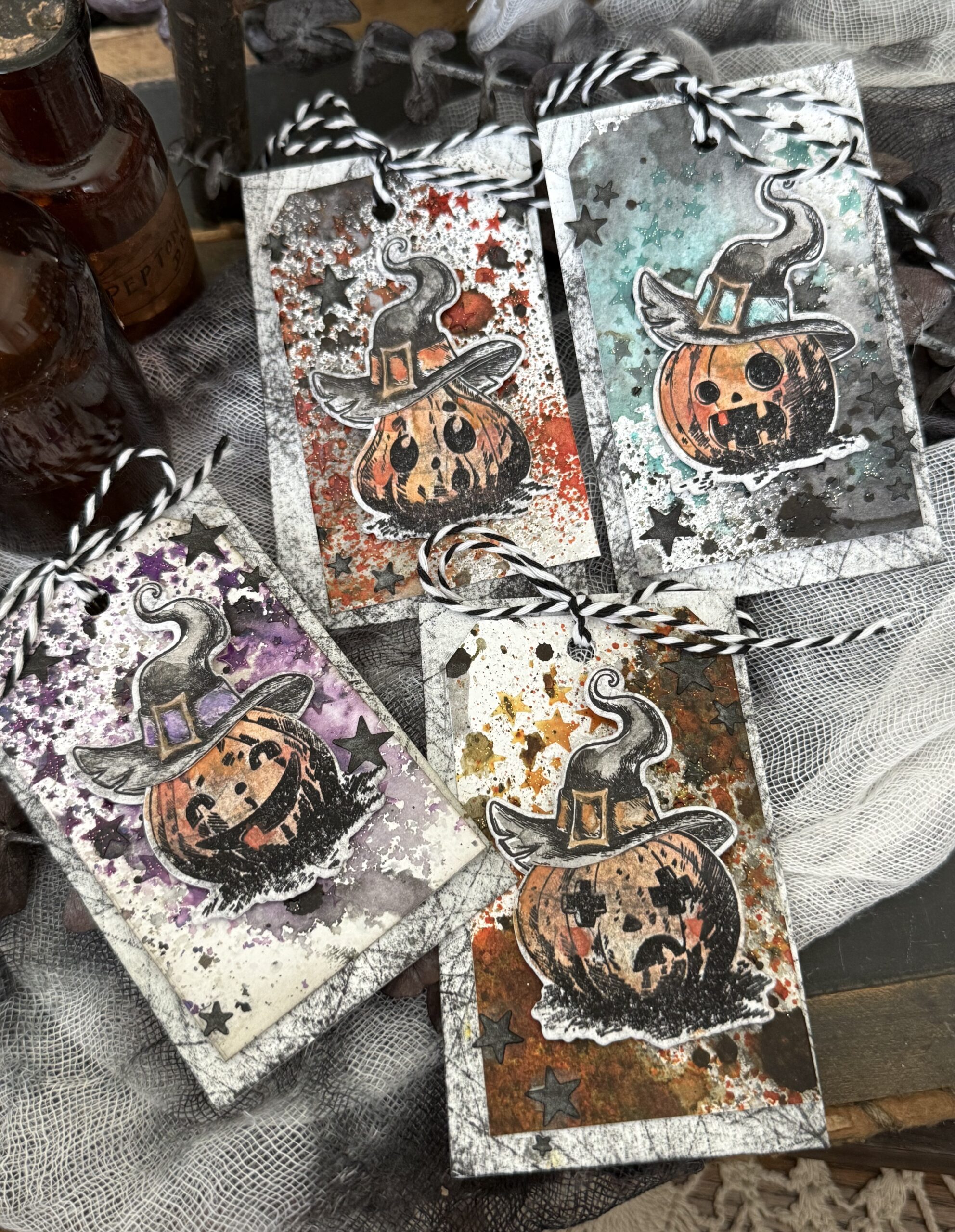 The wafer dies match the stamps perfectly and help when wanting to create quickly without too much fussy cutting. Here I created a card and some tags using the set. Perfect for tying to Halloween Treat bags or favors. Inky Halloween theme is always a GOOD idea! Making tags and inky backgrounds is a favorite thing of mine to do…and those can be made either made or cards!
