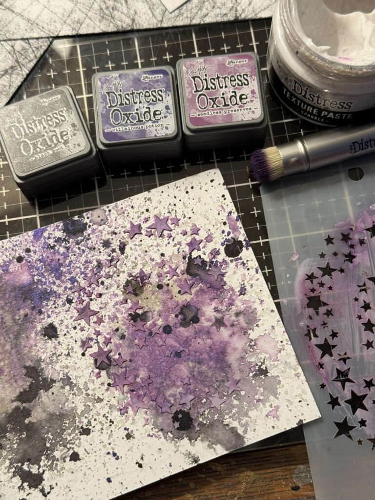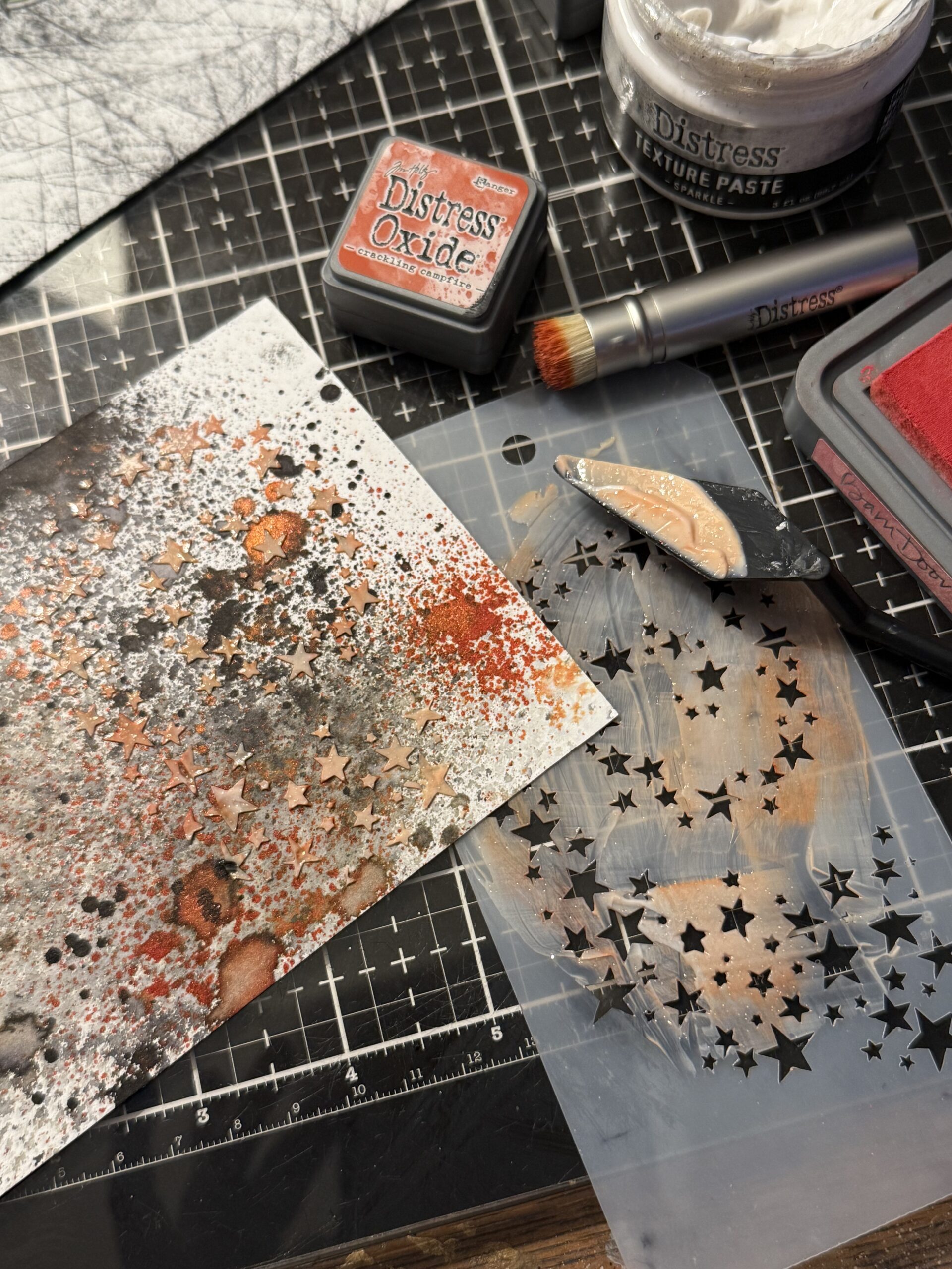 After the backgrounds were dry, I blended a variety of coordinating Distress Inks and Oxides using a blending brush through a star stencil, then after blended, I used a bit of Sparkle Texture Paste through the stencil using a palette knife.