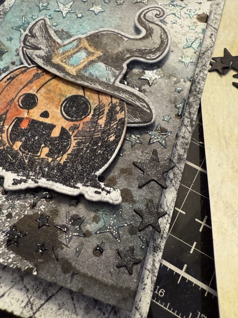 After the stars were adhered, I used a small amount of Distress Mica Stain to add a little shimmer to each of the stars, then dried with a heat tool.