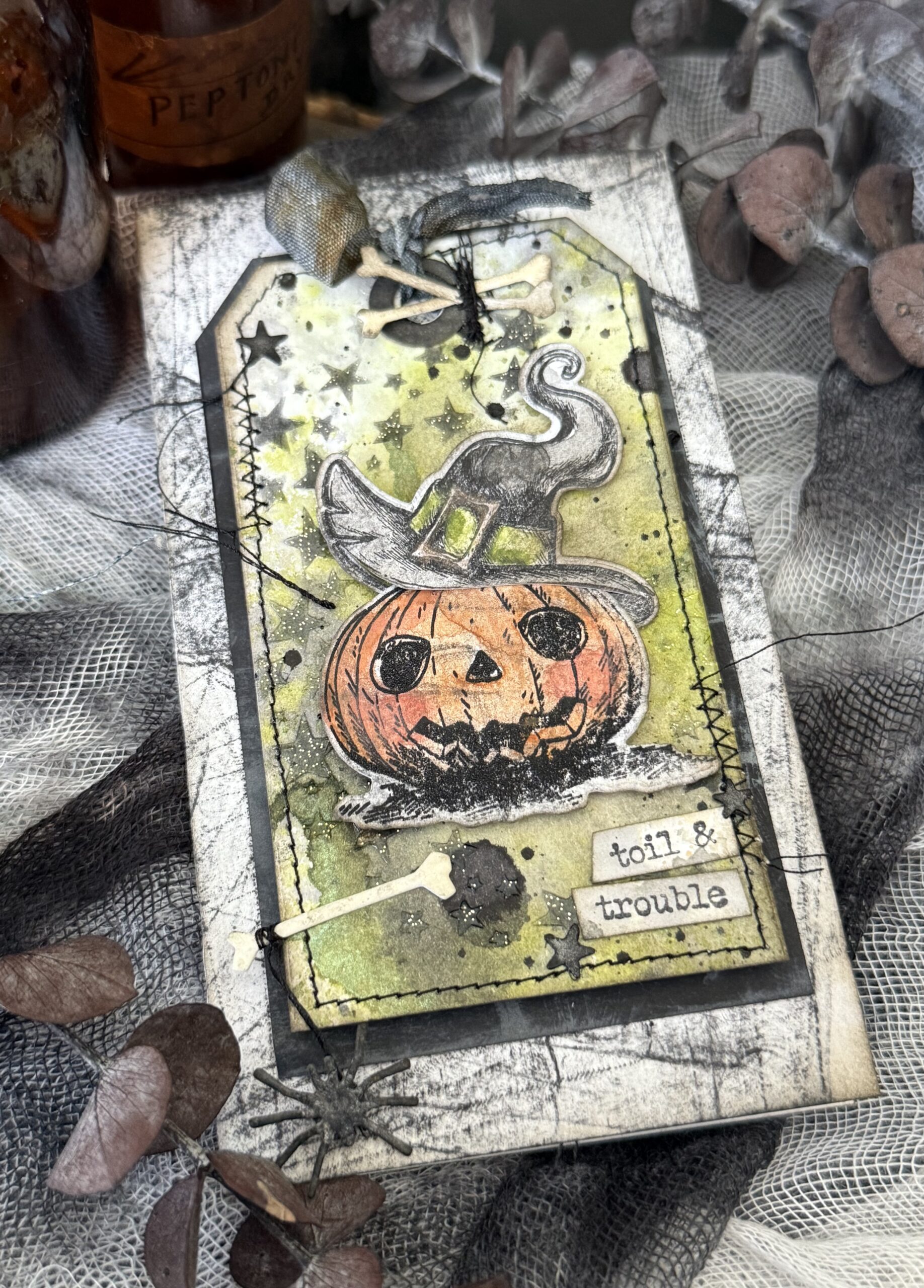 The tag background was created using the Black Soot Archival Ink pad to create a “spiderweb” pattern onto the paper. A quick and easy way to create a spooky background.